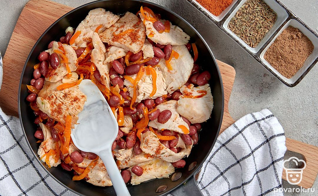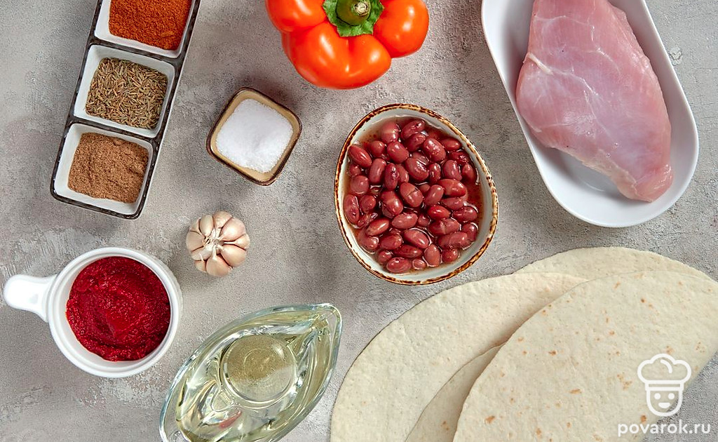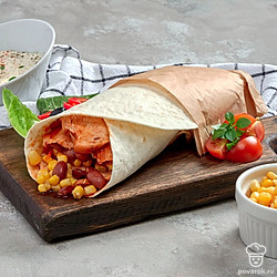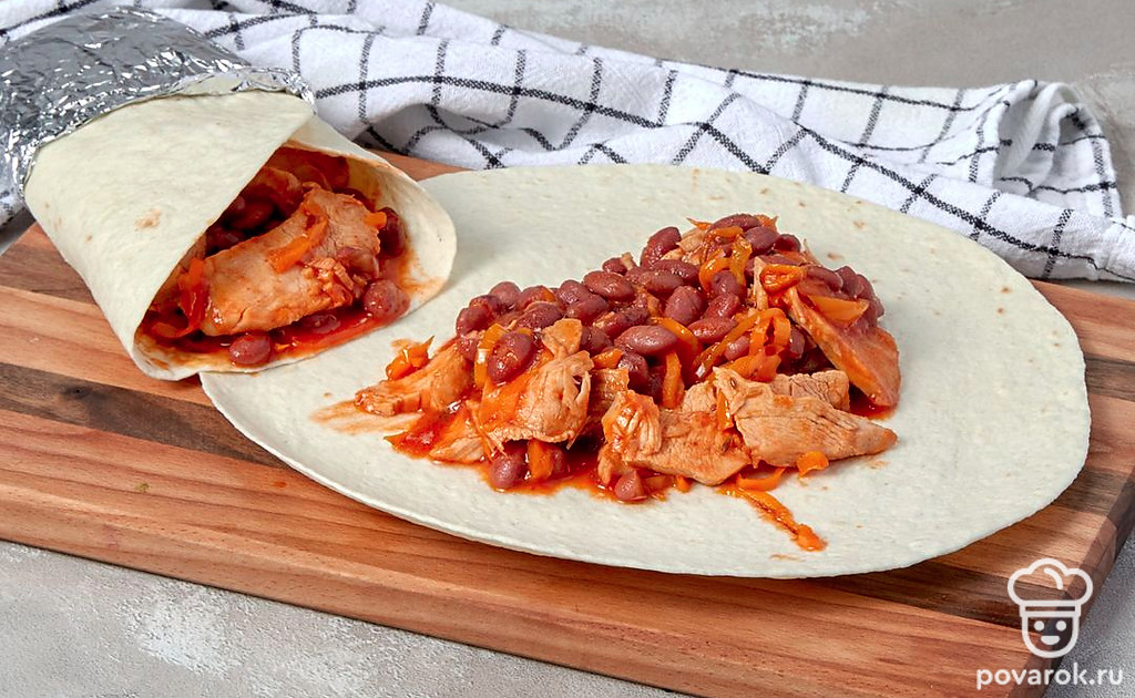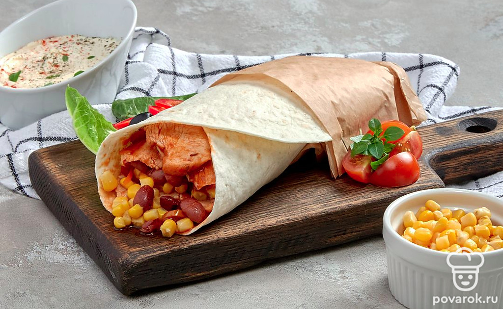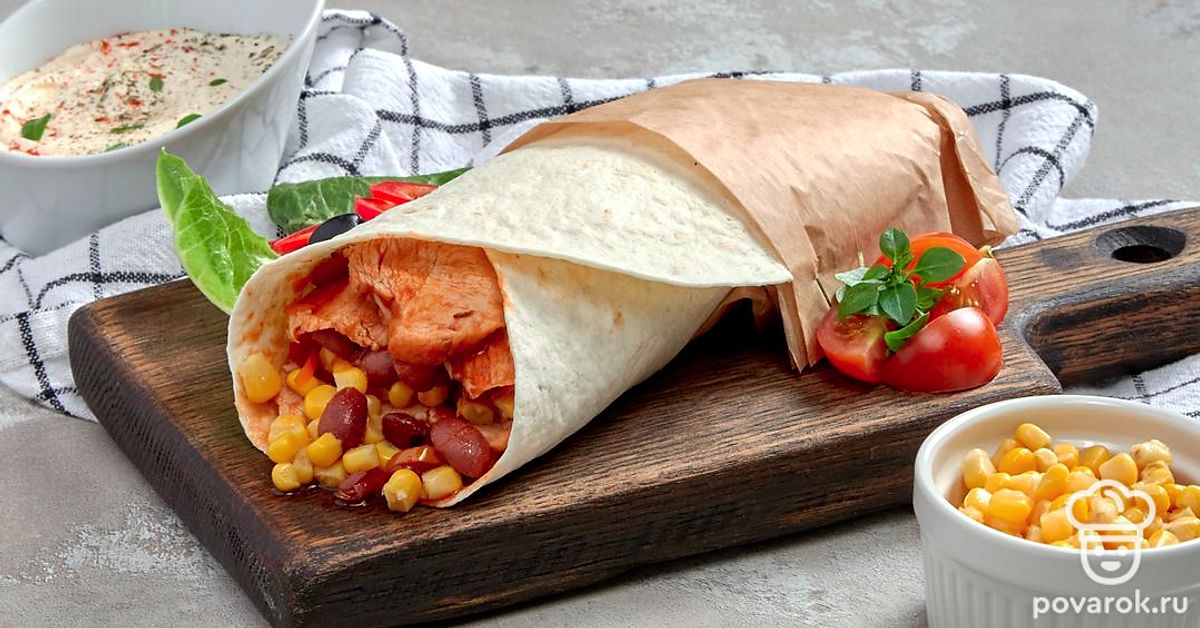 Тортилья с индейкой — сытная и вкусная закуска. Благодаря специям, фасоли и перцу мясо индейки становится сочным и острым. А тонкая мексиканская лепешка — тортилья — это отличная основа для такой начинки. Она готовится из пшеницы или кукурузы и выпекается на открытом огне. В тортилье много витаминов и полезных веществ, которые улучшают пищеварение и нормализуют работу нервной системы.