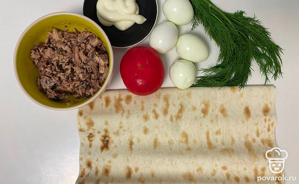 Сварите яйца вкрутую, разомните вилкой тунца, порежьте соломкой помидор.