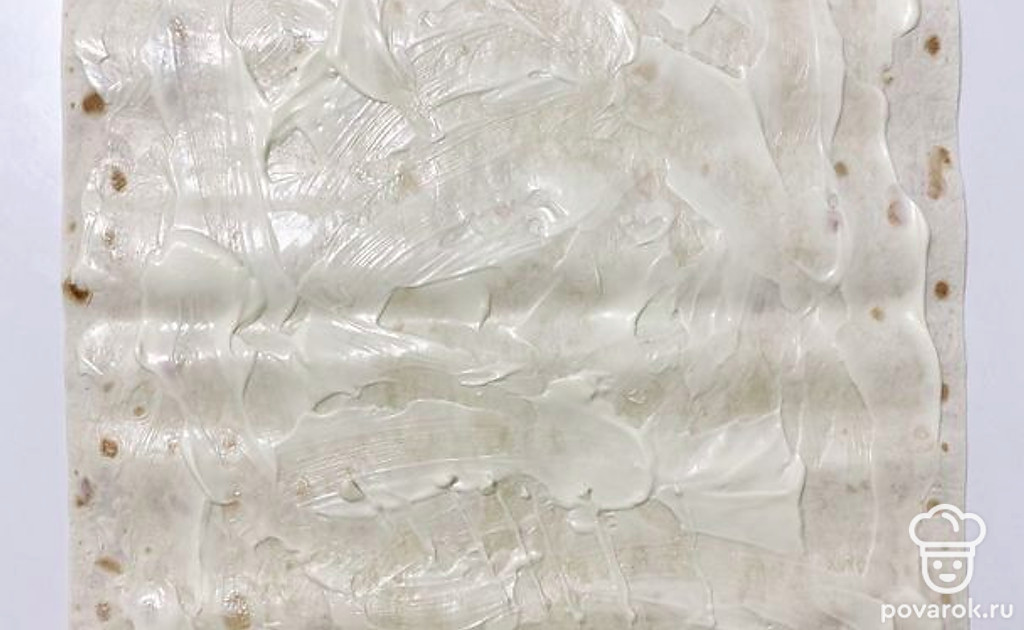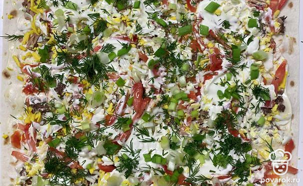 Смажьте второй частью майонеза и посыпьте зеленью (у меня зелёный лук и укроп), добавьте соль по желанию.