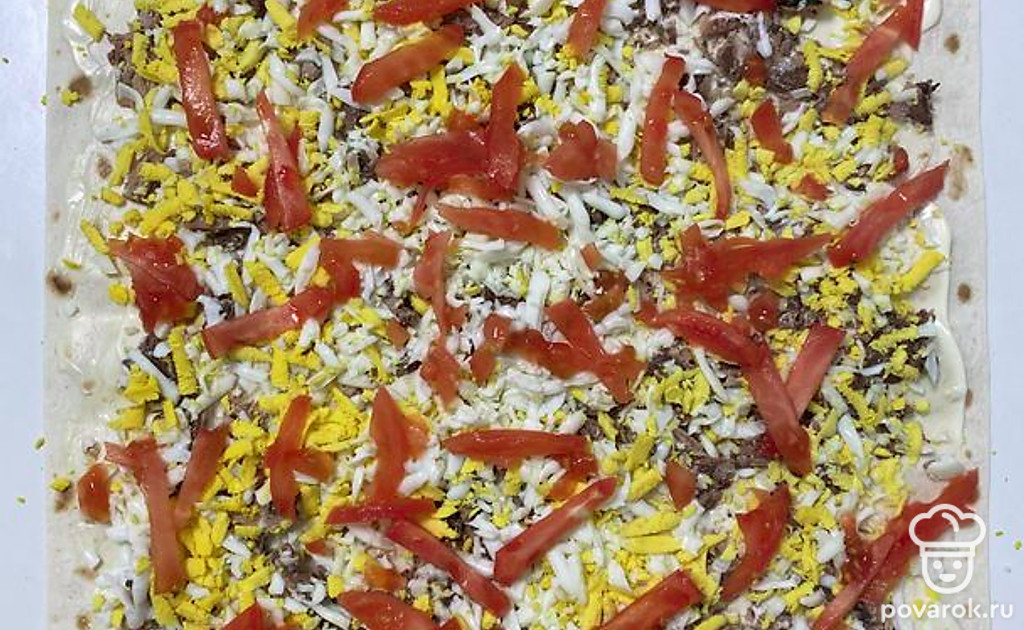 Выложите тунца, сверху натертые на крупной терке яйца и порезанный помидор.