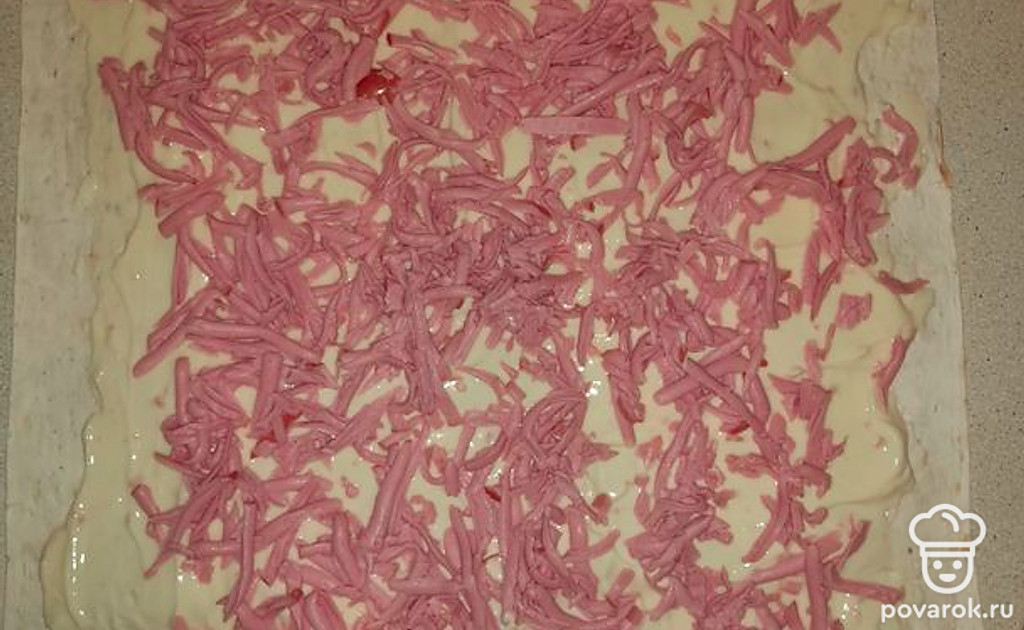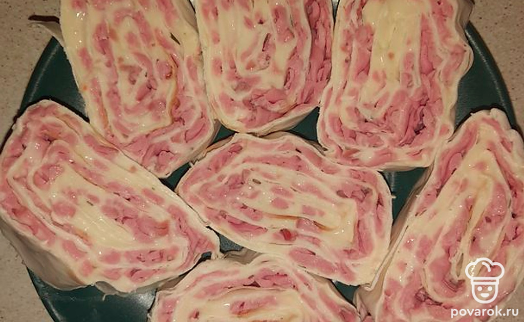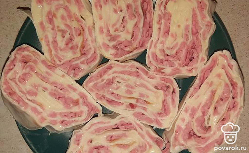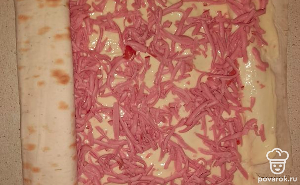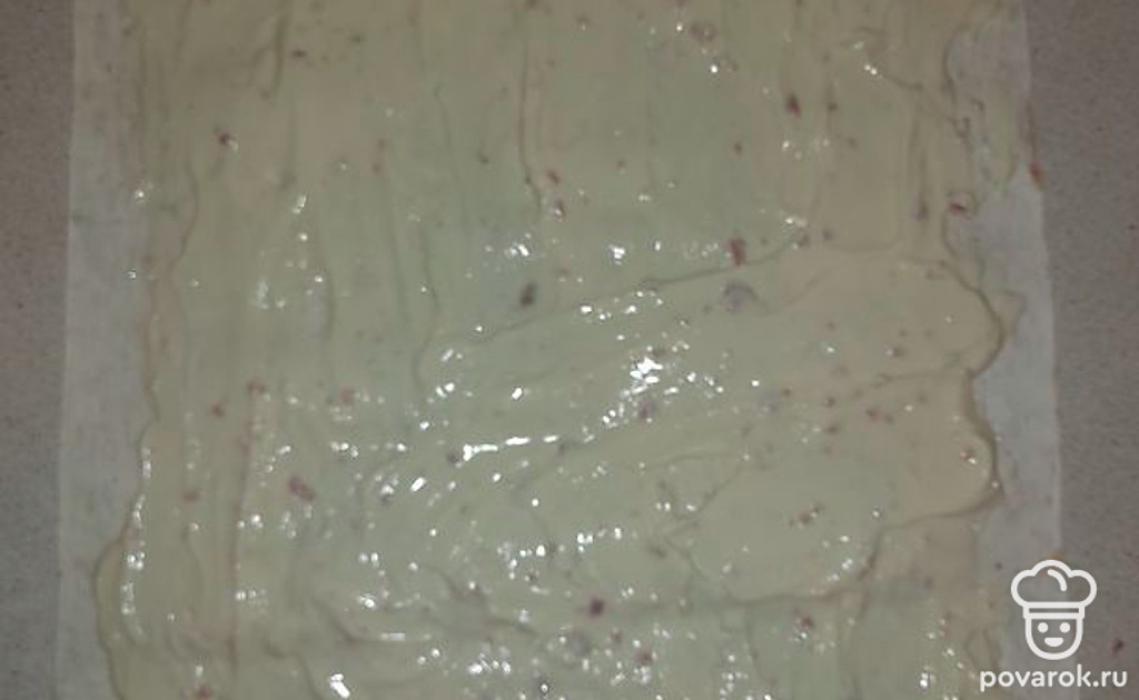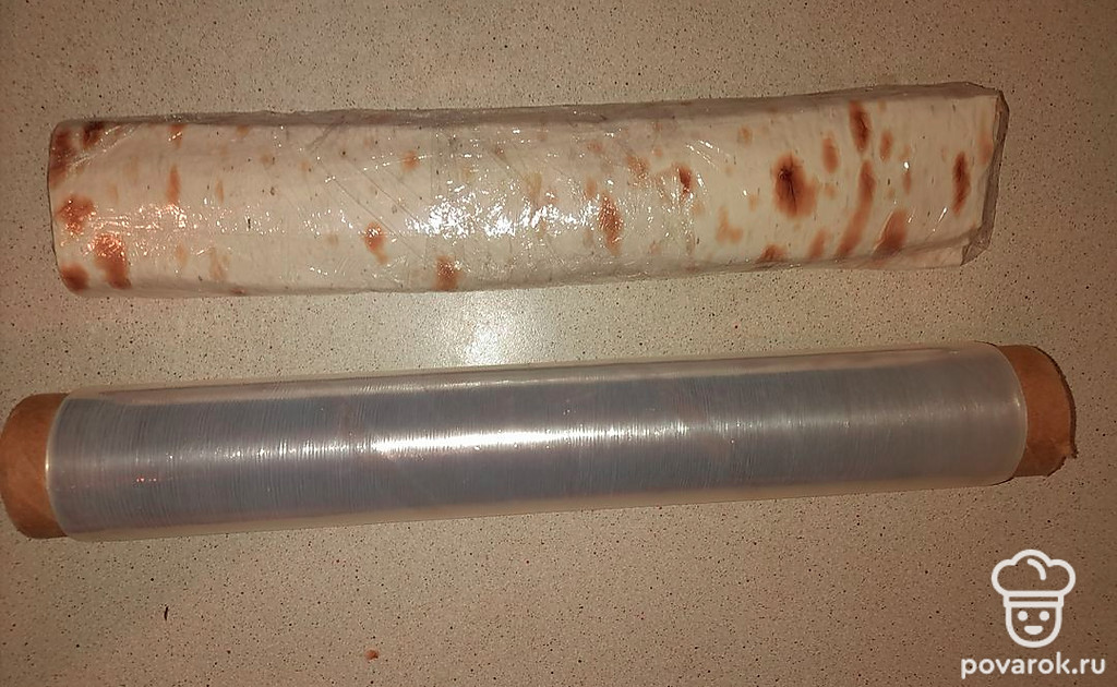 Завернуть рулет в пищевую плёнку и убрать в холодильник на 15-20 минут.