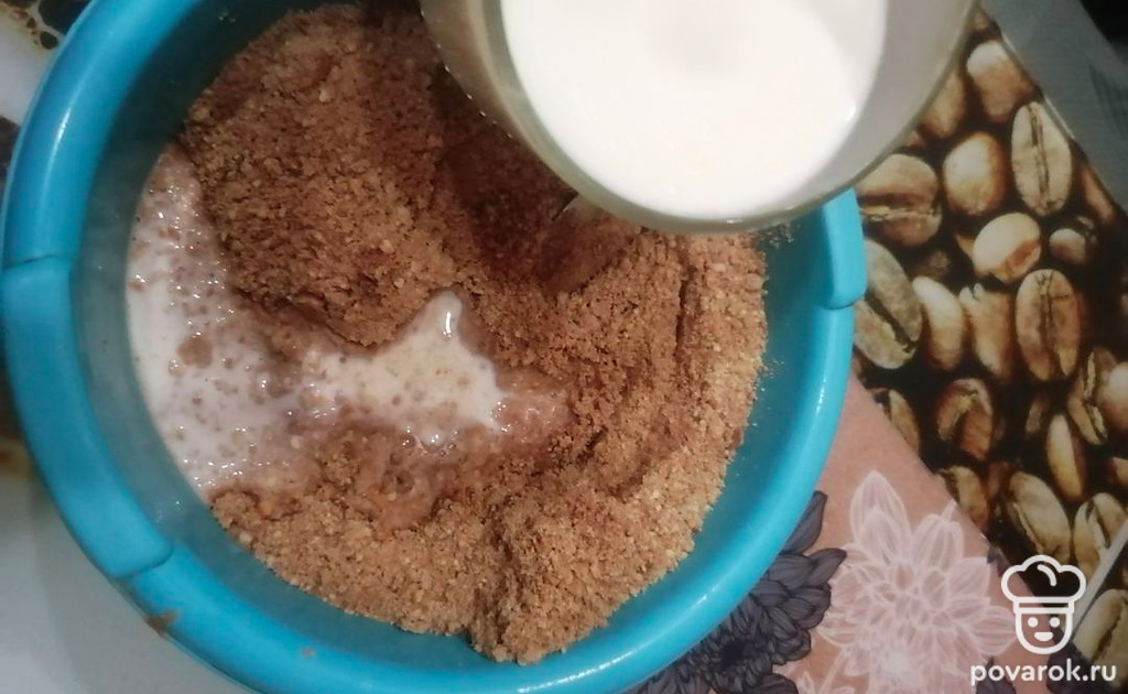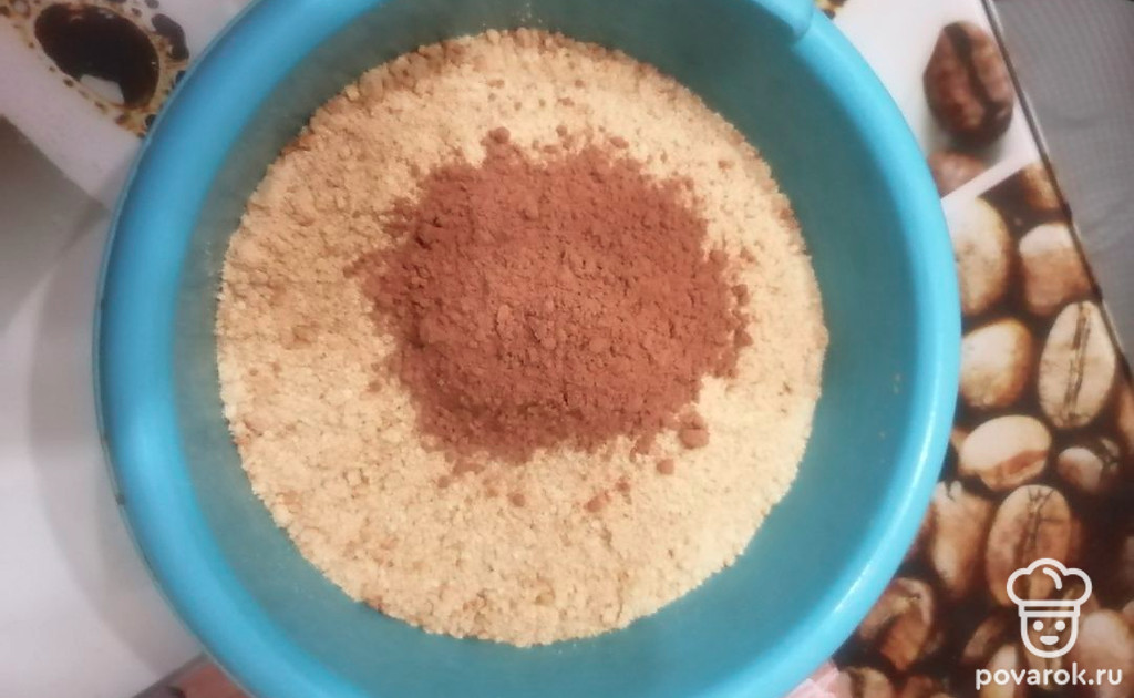 Молоко немного подогреть и вылить в смесь печенья и какао, перемешать.