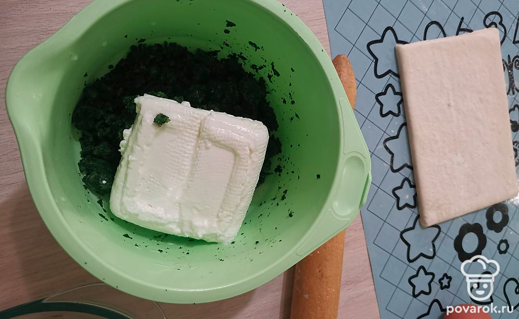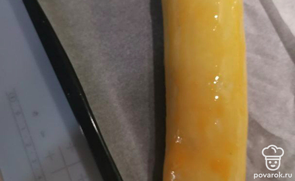 Тесто раскатайте, выложите на него начинку и сверните рулет. Смазать желтком. Выпекайте в духовке при 180 градусах около 40-45 минут.