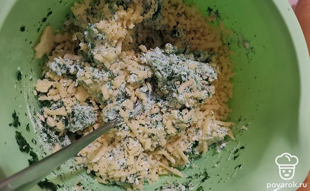 Добавьте сыр, натертый на терке. Посолите, по желанию добавьте чеснок, пропущенный через пресс.