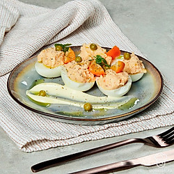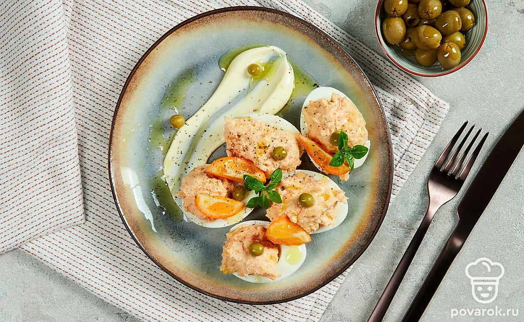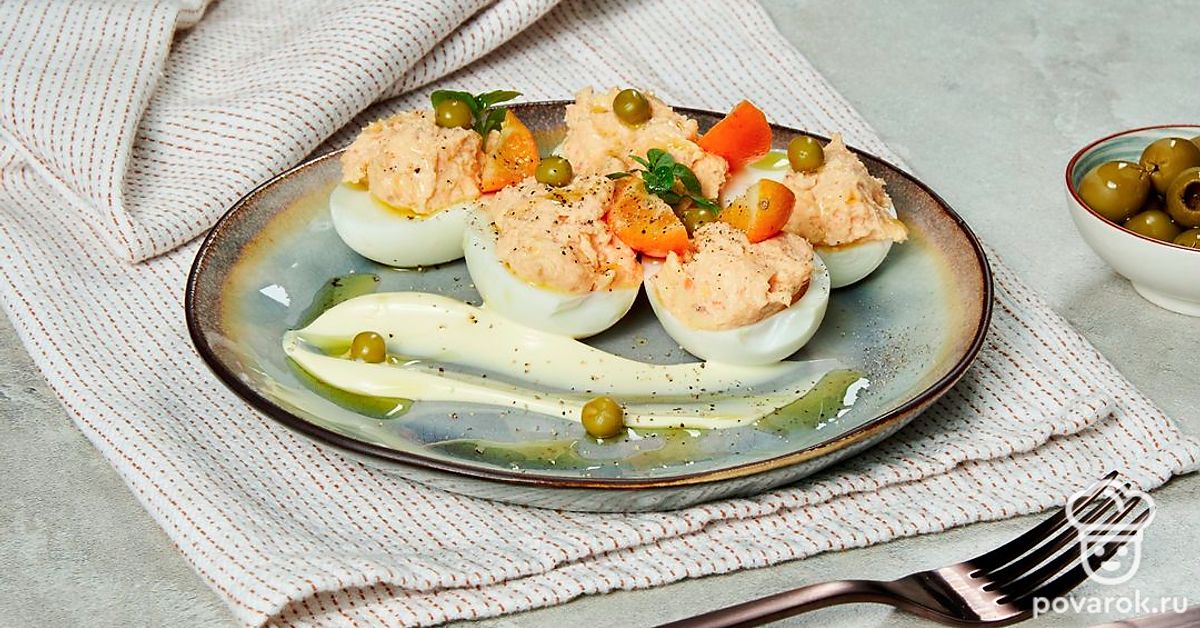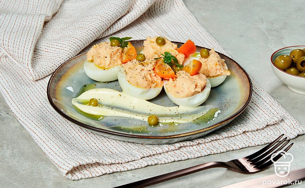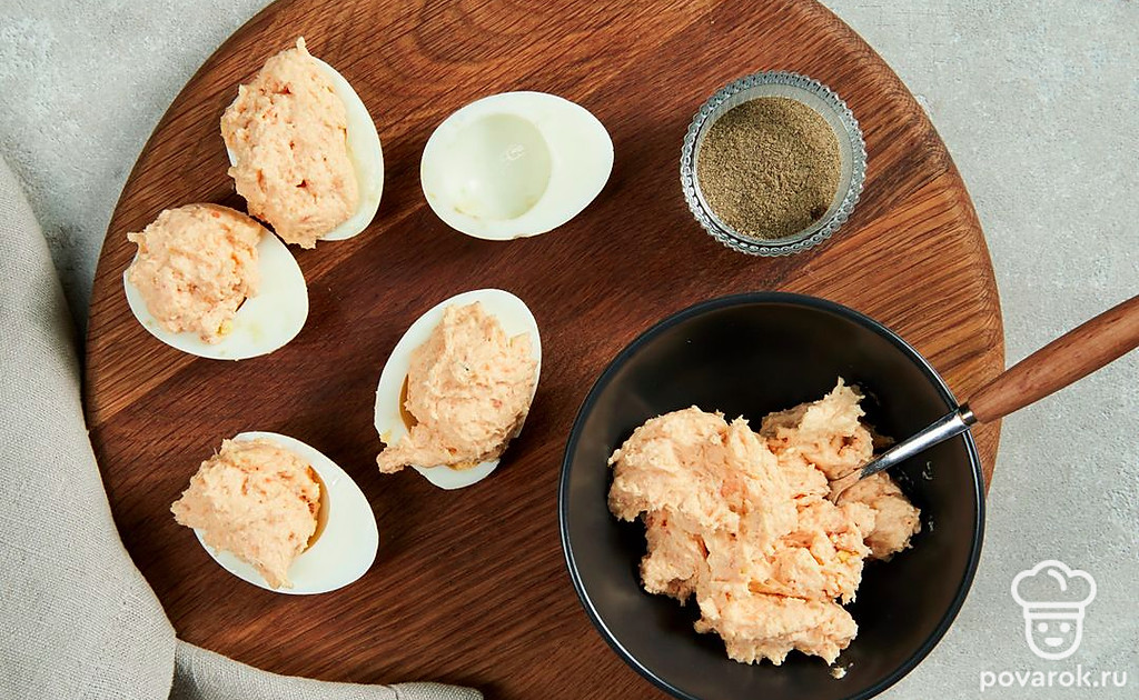 Фаршированные яйца с рыбой могут стать центральной закуской любого праздничного стола. Важным моментом в приготовлении является запекание лосося в духовке,так он будет иметь более насыщенный вкус, что наилучшим образом скажется на конечном результате. Сливочный сыр обеспечит приятную нежную текстуру, но вместо него можно взять любой творожный сыр. Яйца для приготовления закуски нужно варить не дольше 10 минут, иначе желток будет неаппетитным и сухим.