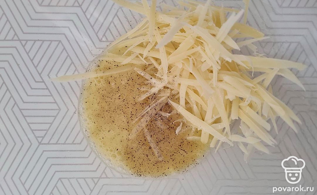 Для начинки смешать вторую часть яйца с натертым сыром, посолить и поперчить. Перемешать.