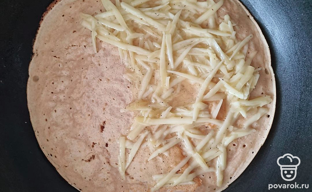 Выложить начинку на одну часть хачапури и свернуть хачапури пополам. Жарить несколько минут под закрытой крышкой, чтобы сыр подплавился.
