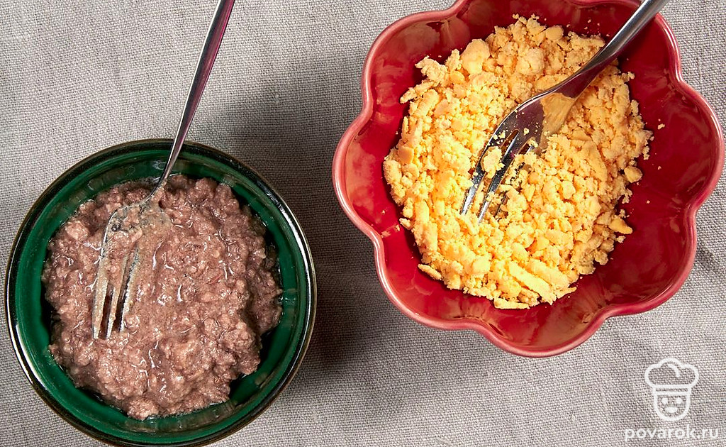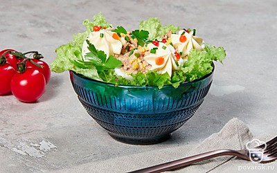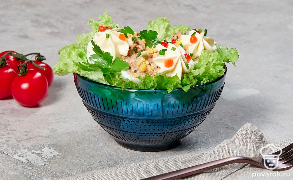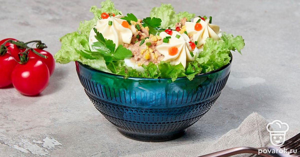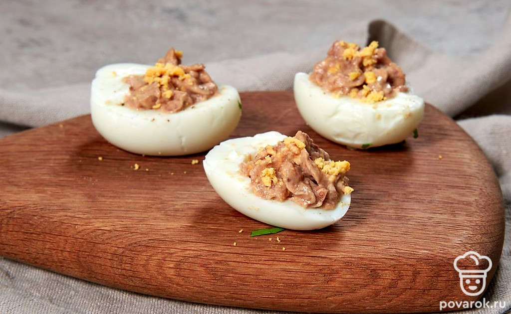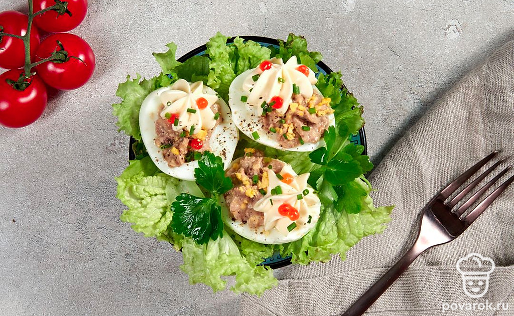 Простая и сытная закуска с печенью трески, которая идеально подойдет для праздничного стола. В качестве украшения укроп можно заменить веточками кинзы или петрушки, а вместо красной икры можно посыпать фаршированные яйца тертым сыром. Печень трески является источником витамина А, необходимого для поддержания зрения и здорового иммунитета, и D, обеспечивающего рост и развитие костей и необходимого для функционирования щитовидной железы.