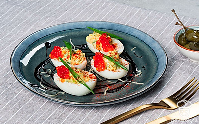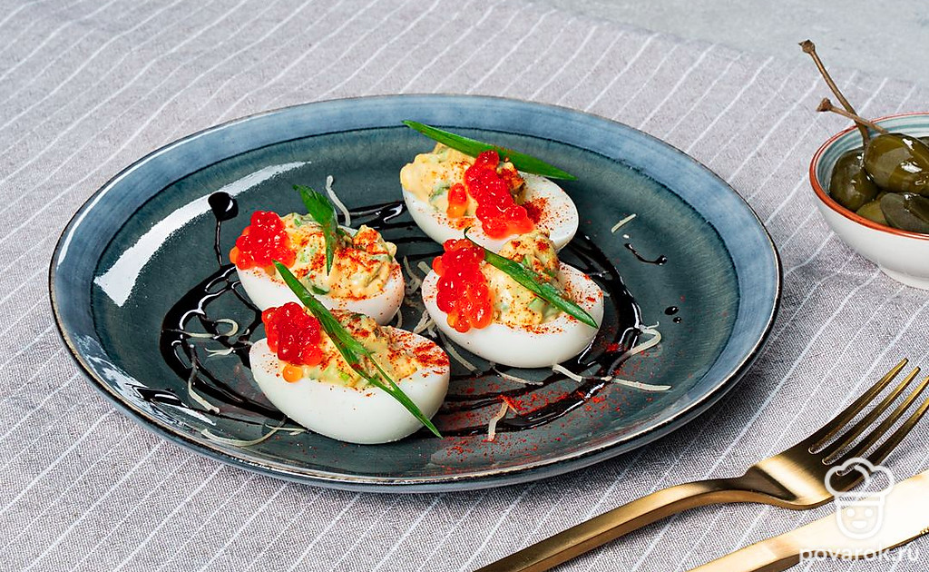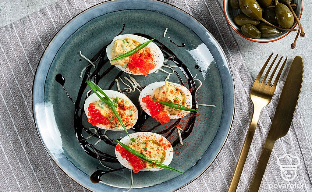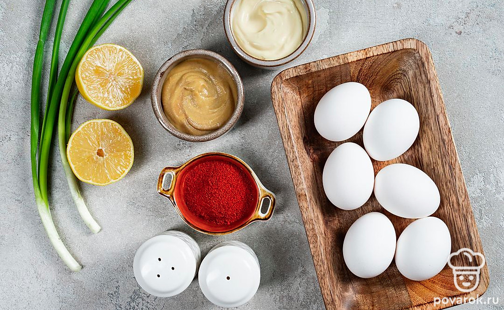 Фаршированные яйца с луком и горчицей — пикантная закуска к любому столу. Паприка придаст ей яркость и приятный аромат. Лимонный сок добавит небольшую кислинку. Все ингредиенты хорошо сочетаются друг с другом и создают уникальный вкус. Антибактериальные свойства зеленого лука поддерживают иммунитет, а эфирные масла в составе лука хорошо влияют на дыхательные пути. Для большей пользы можно добавить также петрушку, укроп или кинзу с рукколой.