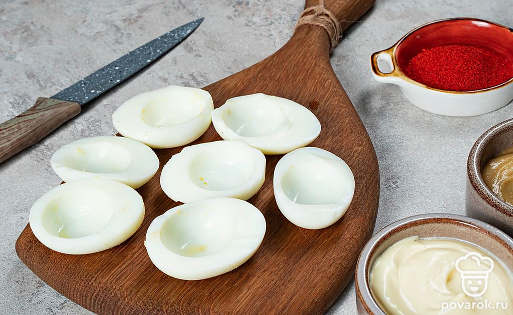 Сварите яйца. В миску положите яйца и залейте их водой. Поставьте на плиту и варите 10 минут после закипания. Остудите в холодной воде и очистите от скорлупы. Разрежьте каждое яйцо пополам и уберите желтки.