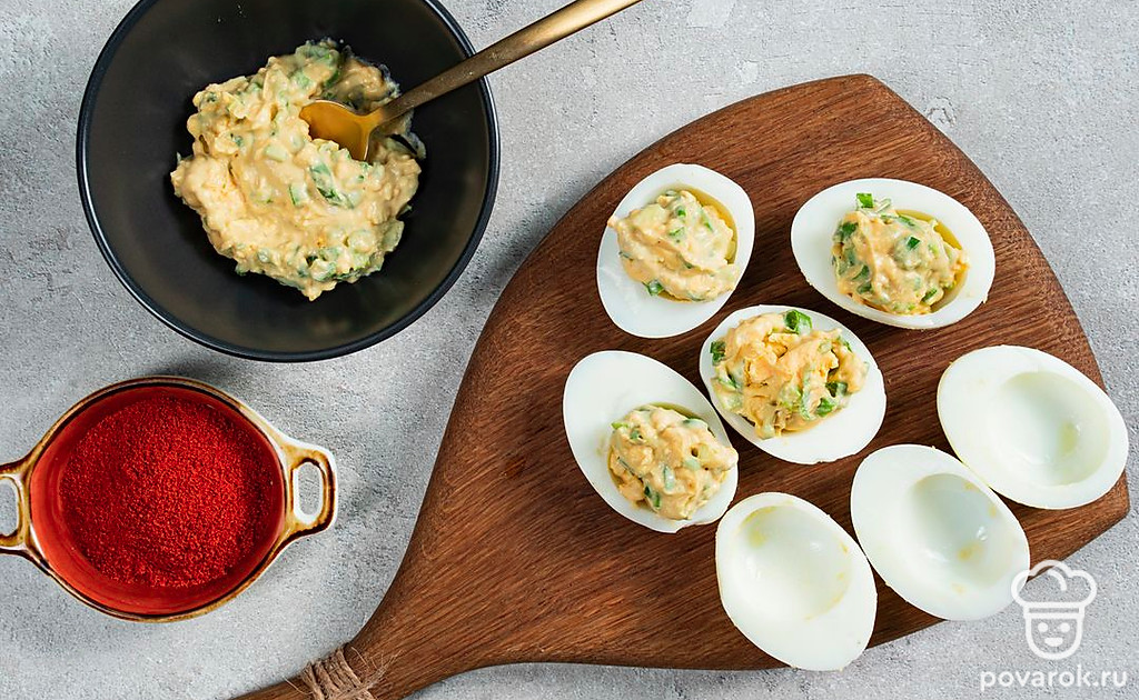 Приготовьте фаршированные яйца. Желтки разомните вилкой. Смешайте в миске желтки, нарезанный средними кусочками зеленый лук, майонез, горчицу, посолите и поперчите по вкусу, добавьте лимонного сока. Перемешайте и выложите в каждую половинку белков начинку. Затем посыпьте паприкой.