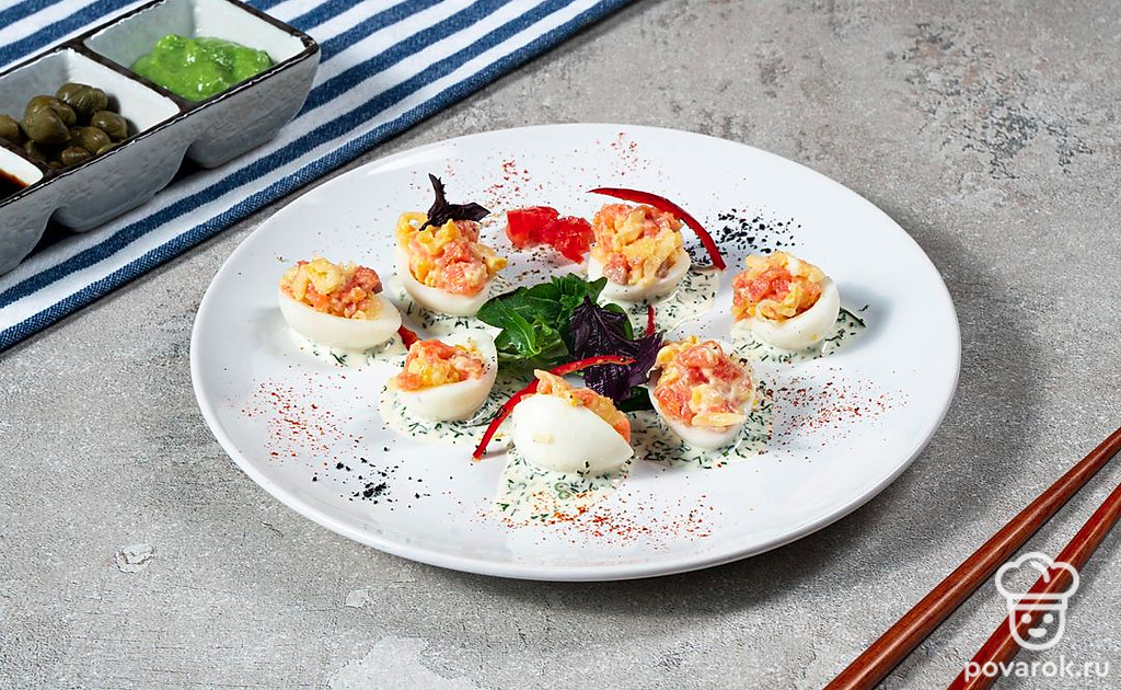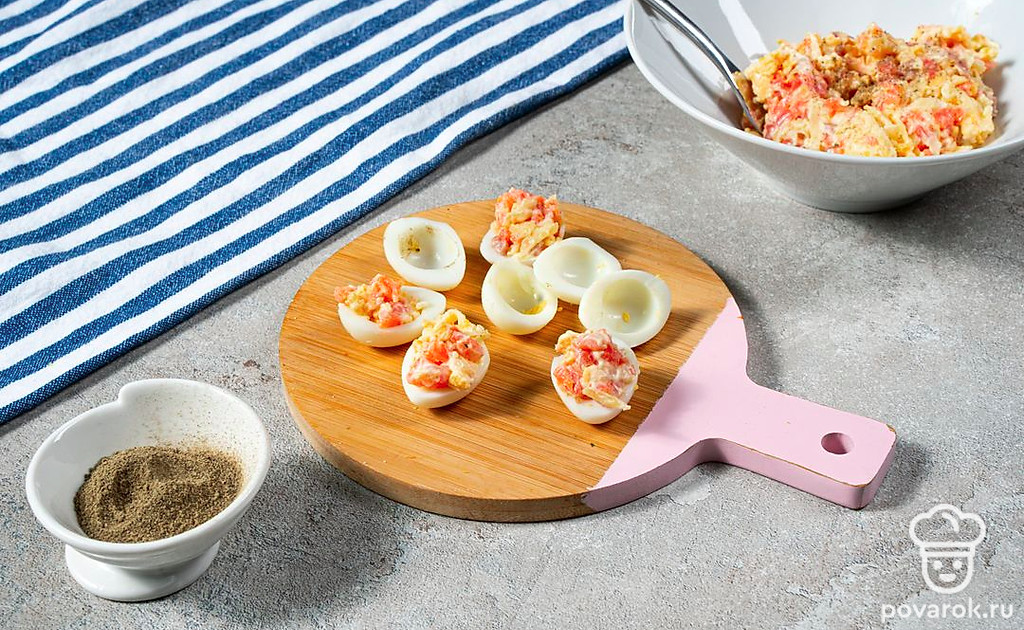 Смешайте начинку и заполните яйца. В емкости смешайте растертые желтки, лосось, сыр, майонез и молотый перец. Половинки яиц заполните начинкой.