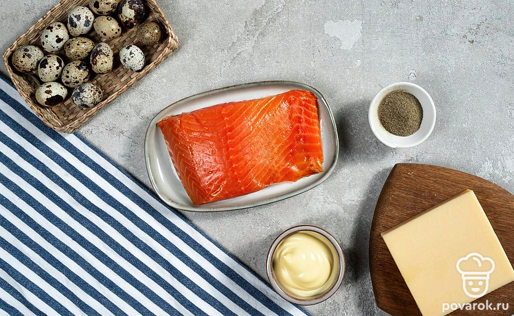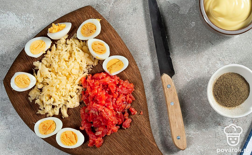 Порежьте ингредиенты для фаршированных яиц. Лосося порежьте мелкими кубиками примерно 0,2х0,2 см. Яйца разделите пополам и извлеките из каждого желток. Сыр измельчите на терке.