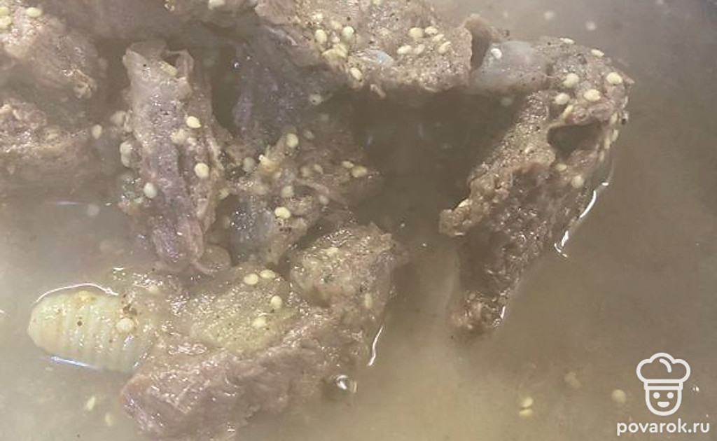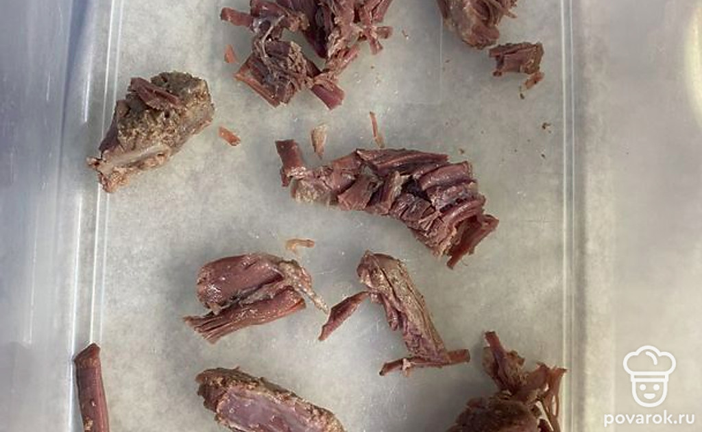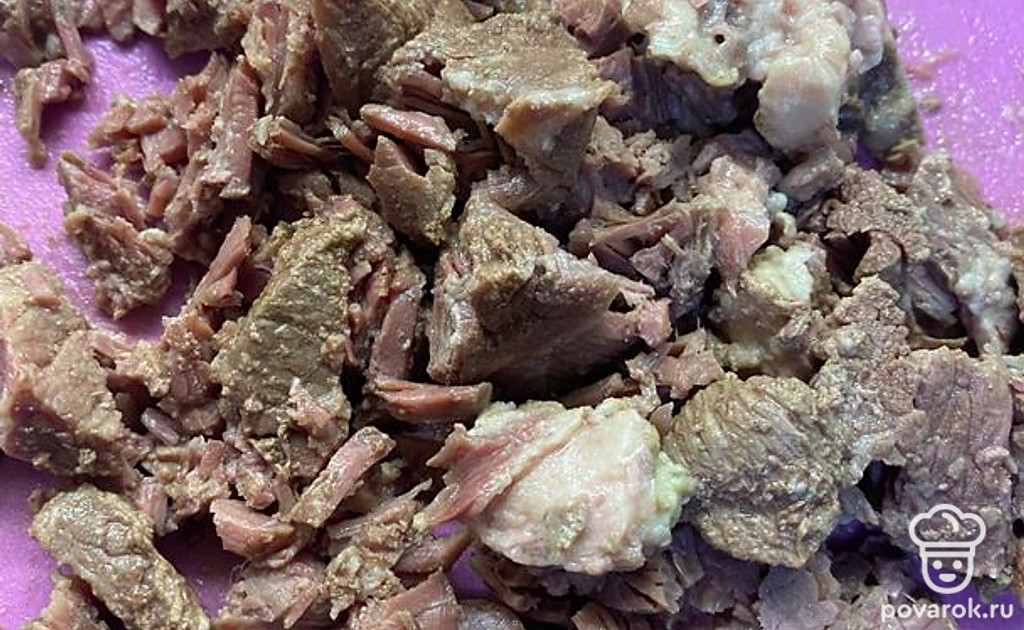 По готовности остужаем бульон и говядину раздельно. Говядину разрезаем на мелкие квадраты.