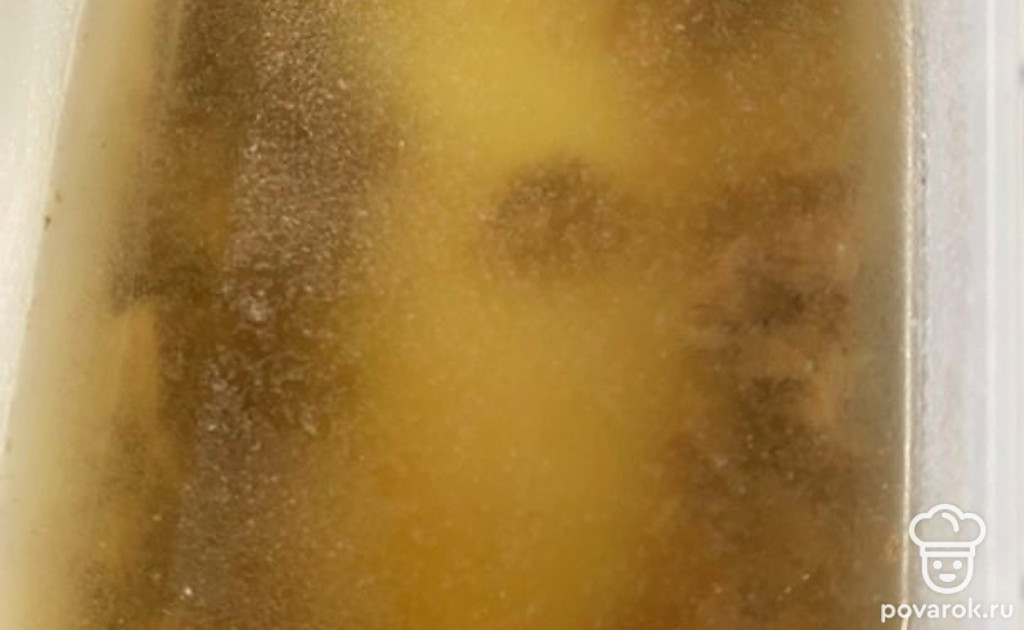 Сверху заливаем бульоном. В этот холодец не добавляются ни яйца, ни овощи. В конечном итоге получаем прозрачный холодец и отборное мясо.