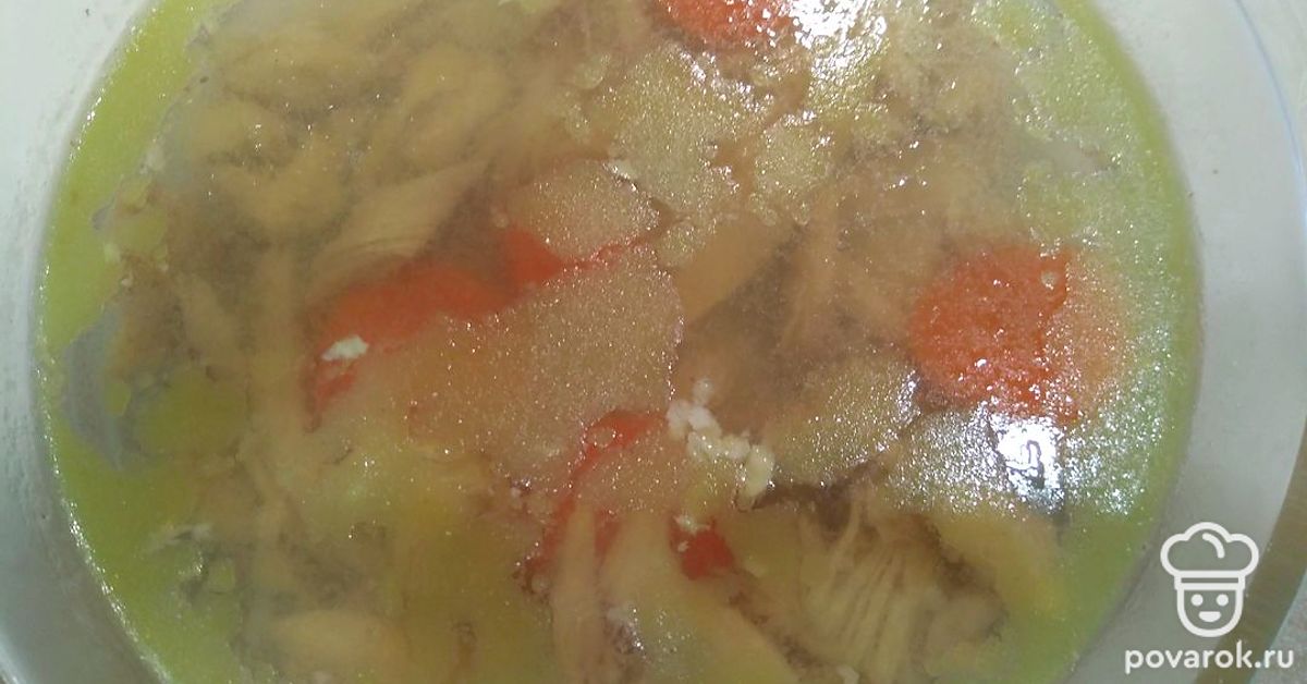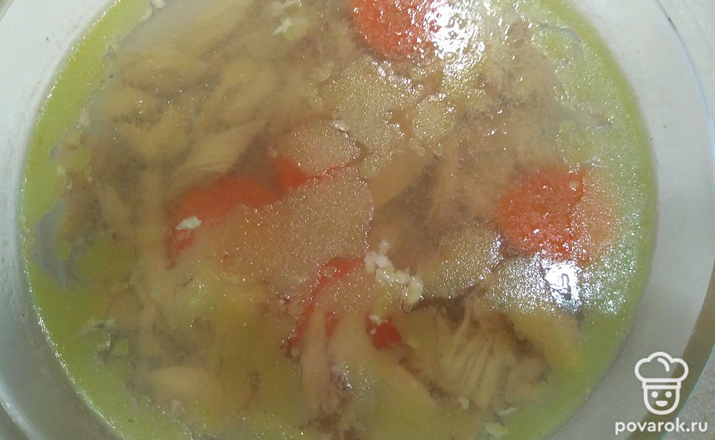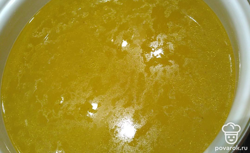 Процедите бульон и добавьте туда готовый желатин и чеснок, хорошо перемешайте.