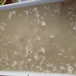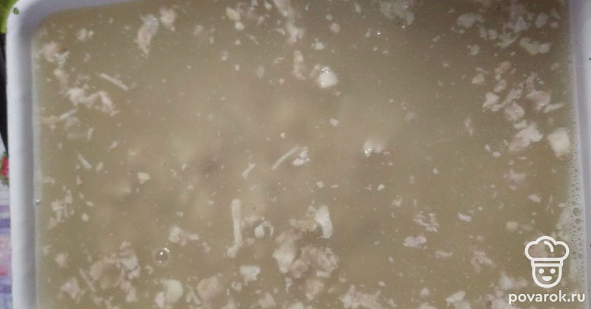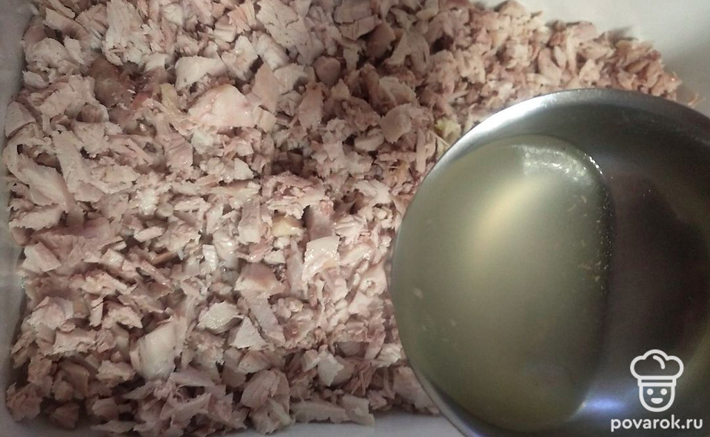 Замачивайте желатин по инструкции. Когда желатин набухнет, разведите его куриным бульоном. Можно добавлять половником, чтобы было удобно, перемешайте. Подогрейте, чтобы желатин хорошо растворился, но не доводите до кипения.