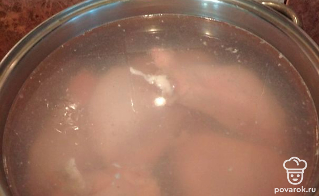 Хорошо промойте куриные окорочка. Положите мясо в большую емкость и залейте ее водичкой. Поставьте кастрюлю на плиту и накройте крышкой.