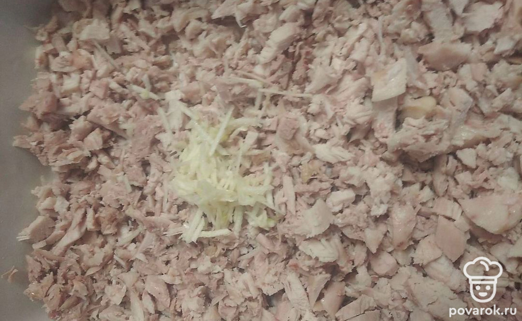 Курицу отделите от костей, разрежьте на мелкие кусочки, поместите в отдельную посуду или форму, добавьте натёртый чеснок и хорошо перемешайте.