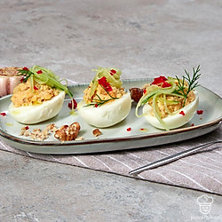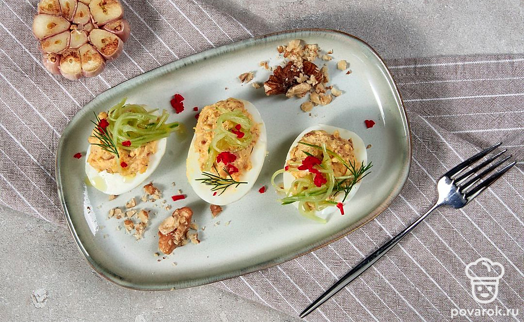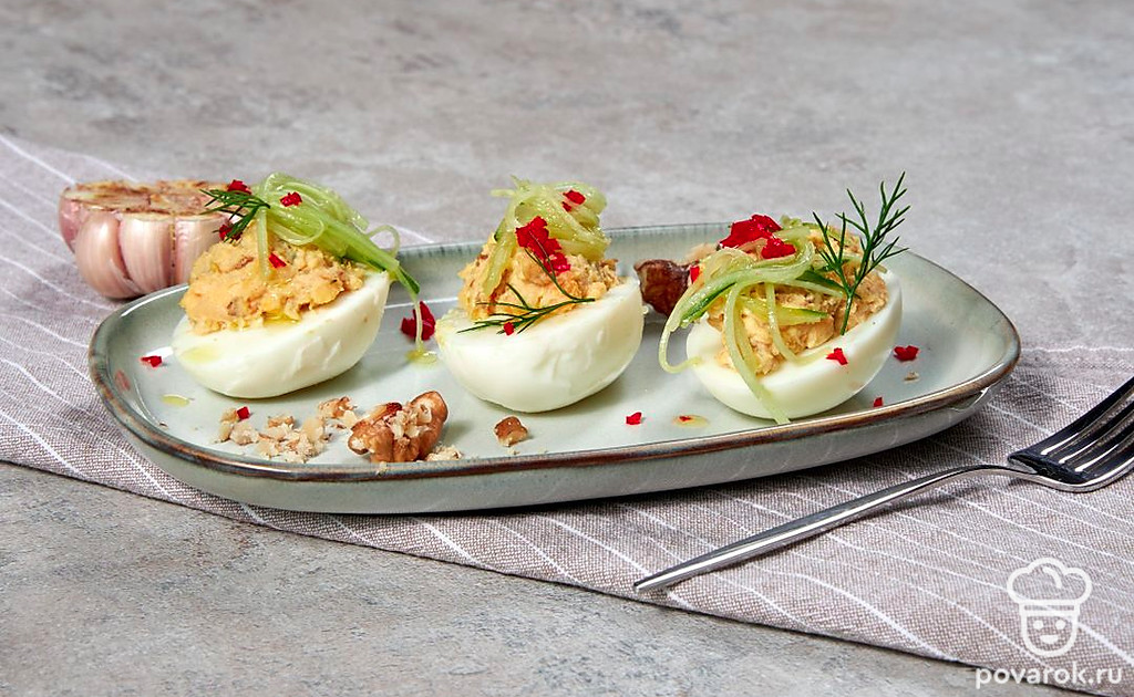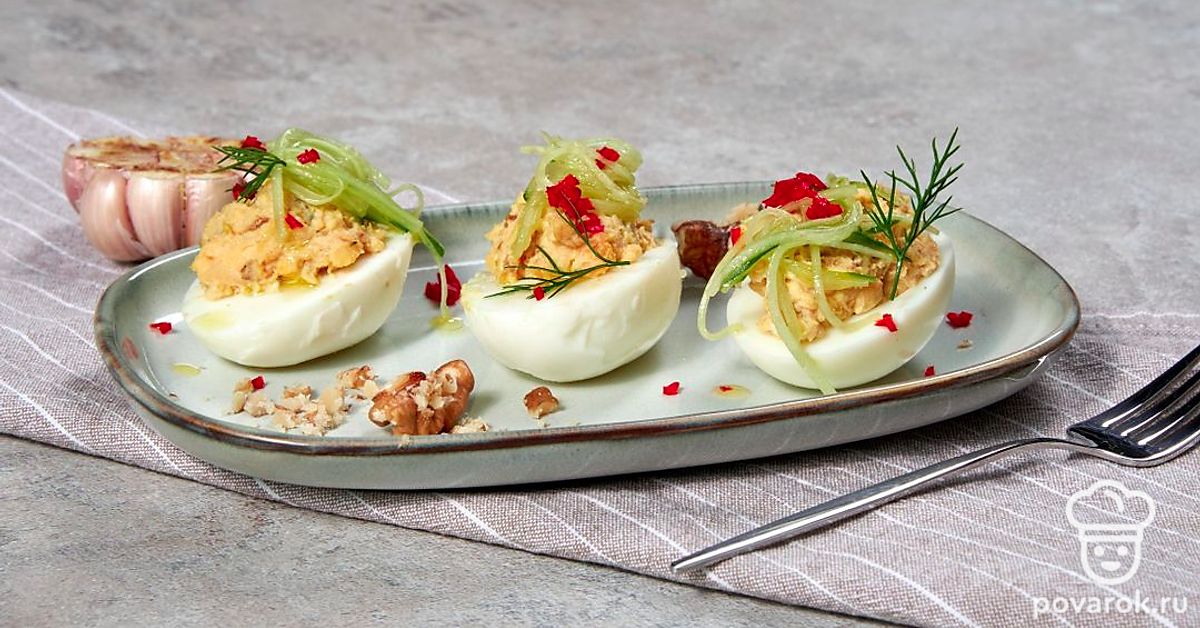 Добавьте в начинку для фаршированных яиц дробленые грецкие орехи. Их потребуется немного, примерно 50 г, чтобы придать особый оттенок вкусу и добавить пользы закуске.