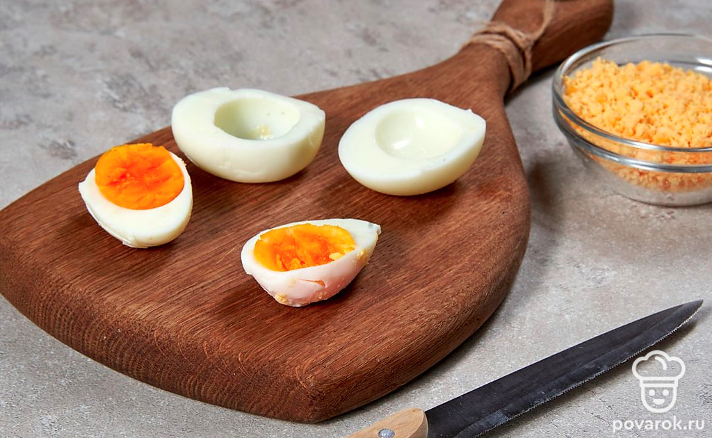 Подготовьте яйца. Отваренные яйца очистите от скорлупы и разрежьте пополам. Желтки извлеките и переложите в отдельную емкость. Половинки белков разложите на блюде с плоским дном.