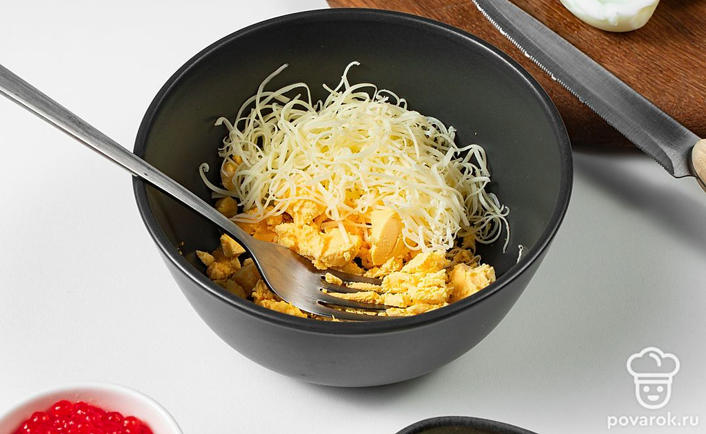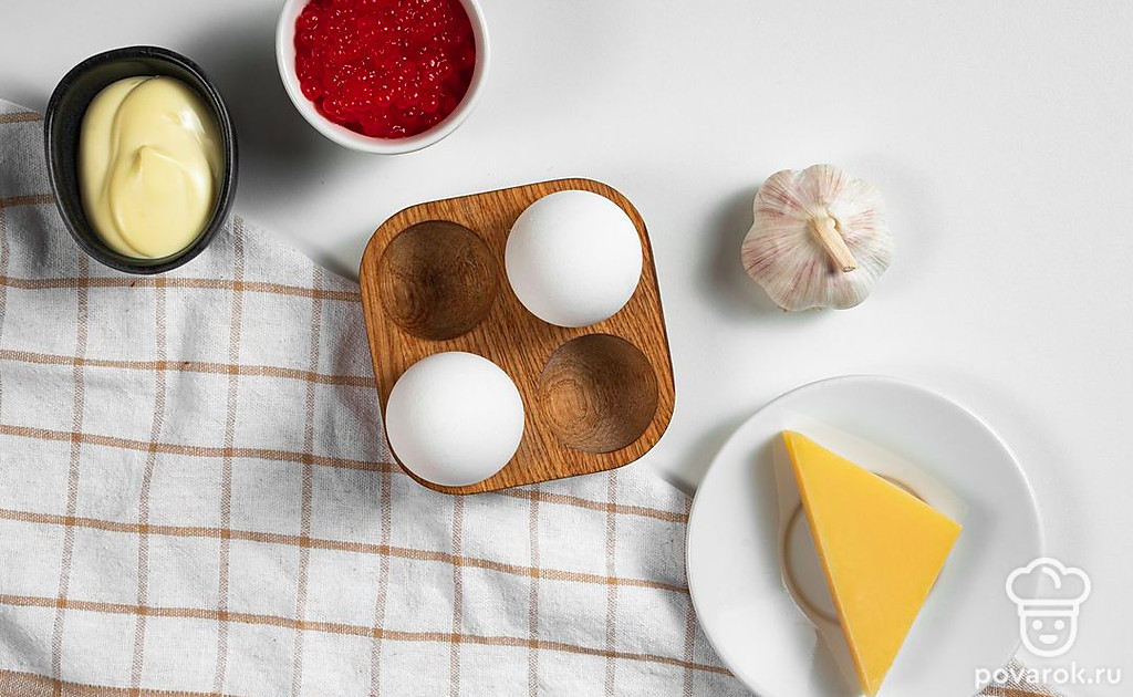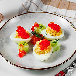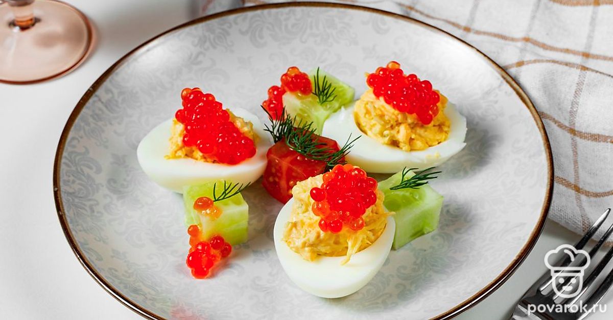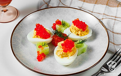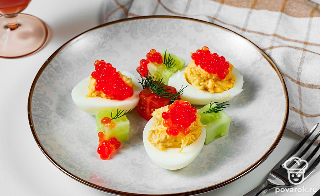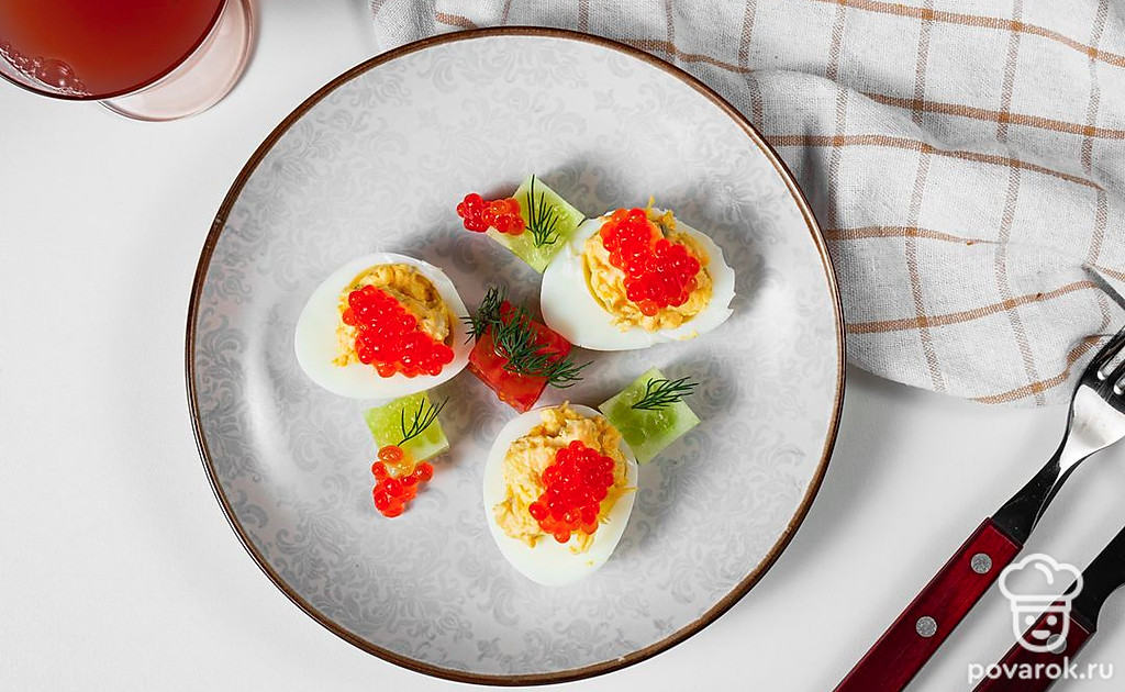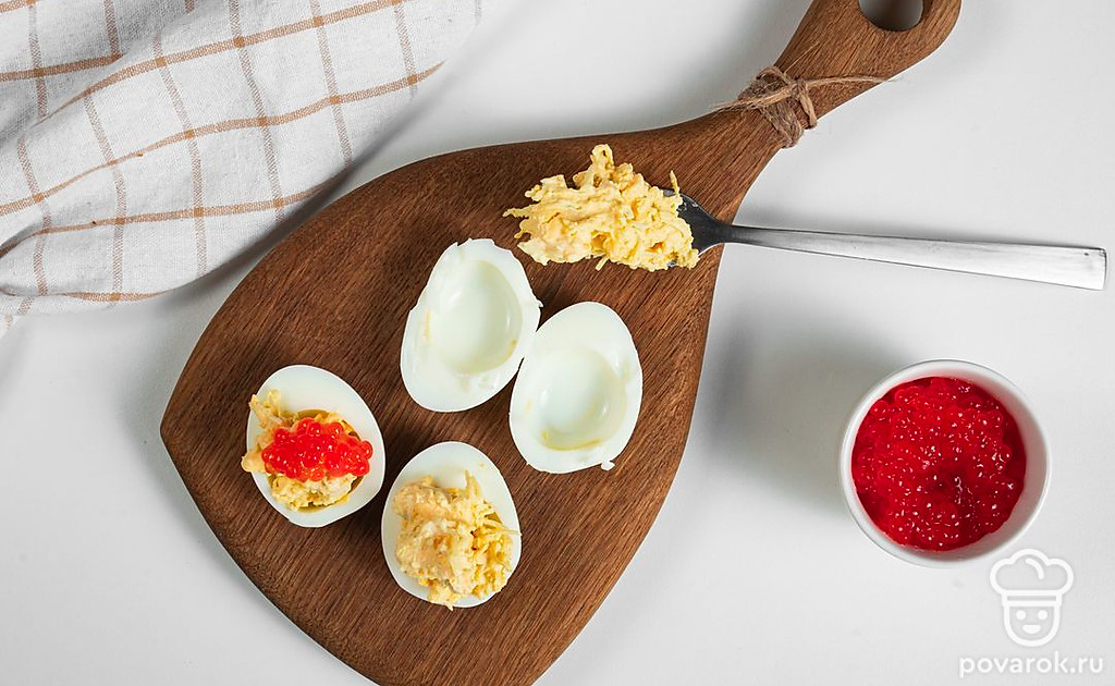 Яйца, фаршированные красной икрой — отличная закуска для новогоднего стола, изысканный деликатес, который доставит немало удовольствия. Для закуски можно взять уже готовую икру или приготовить ее самостоятельно. Красная икра солится в растворе, где на 1 л воды приходится 350 г соли. Икру необходимо промыть и удалить пленку, затем погрузить в солевой раствор на 5 минут. Затем нужно переложить икру в марлю и оставить на 30 минут в подвешенном состоянии. Такая икра хранится не более 3 суток.