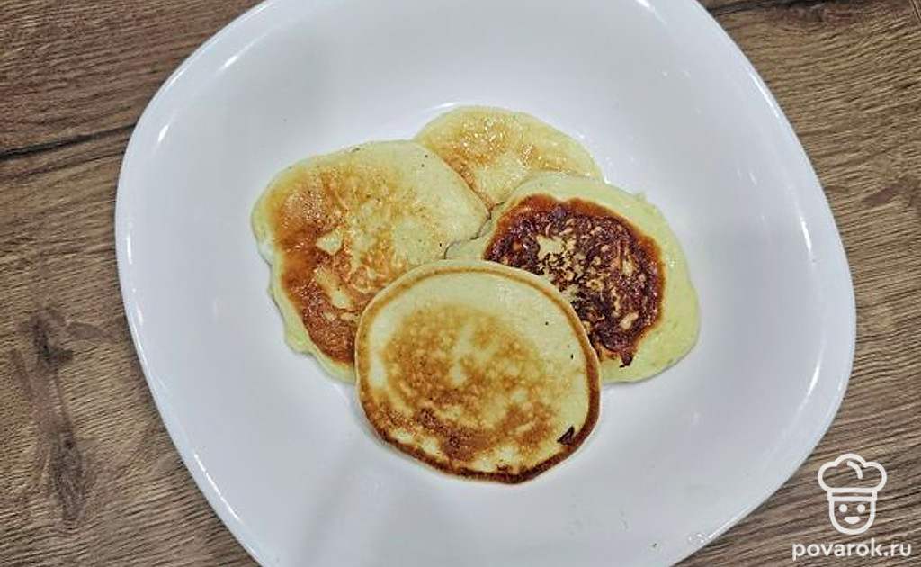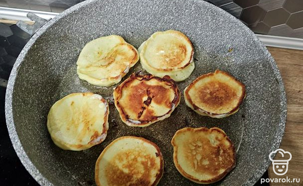 Жарьте оладьи с двух сторон до золотистой корочки. Томите примерно по 3 минуты с каждой стороны.