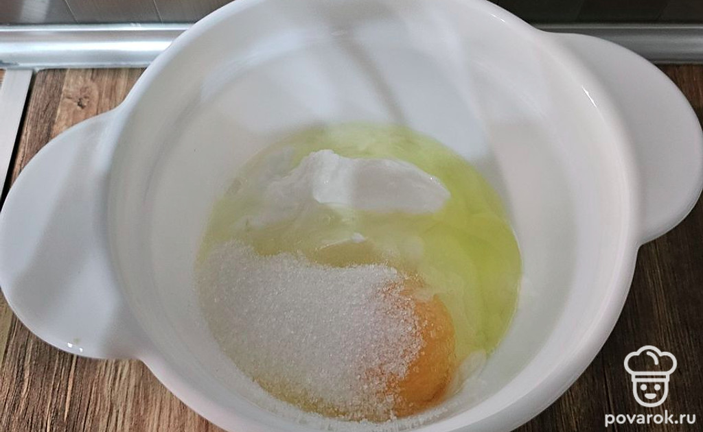 Соедините греческий йогурт, яйцо, сахар. Перемешайте. Добавьте муку и разрыхлитель.