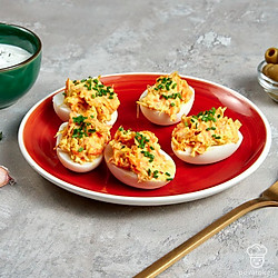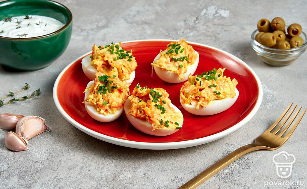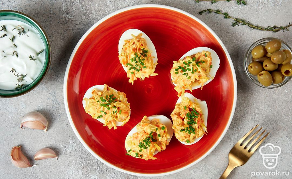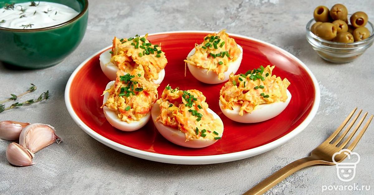 Тем, кто находится в поисках простого, но интересного рецепта вкусной закуски для праздничного стола, этот прекрасно подойдет. Фаршированные яйца с морковью и луком — универсальное блюдо, знакомое многим с детства. Все необходимые для приготовления ингредиенты наверняка найдутся в холодильнике каждой хозяйки. А готовка закуски займет не более 15 минут.