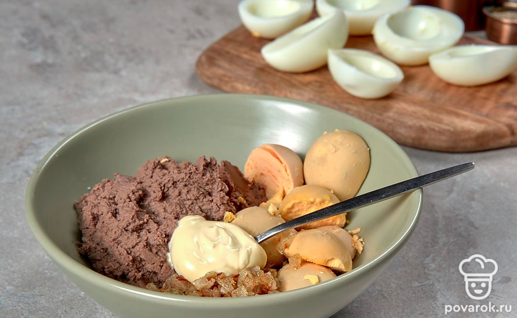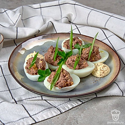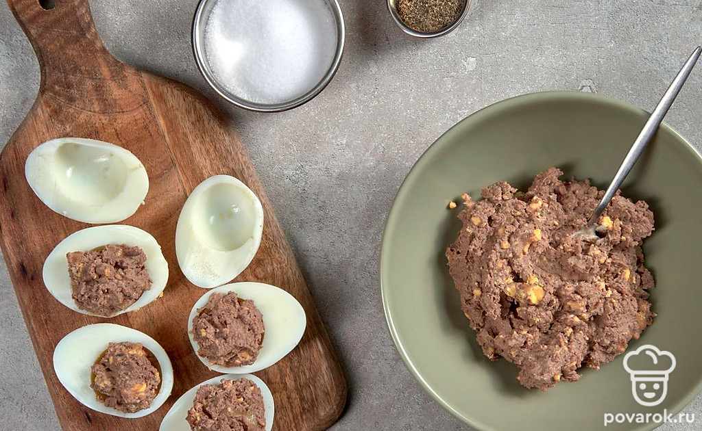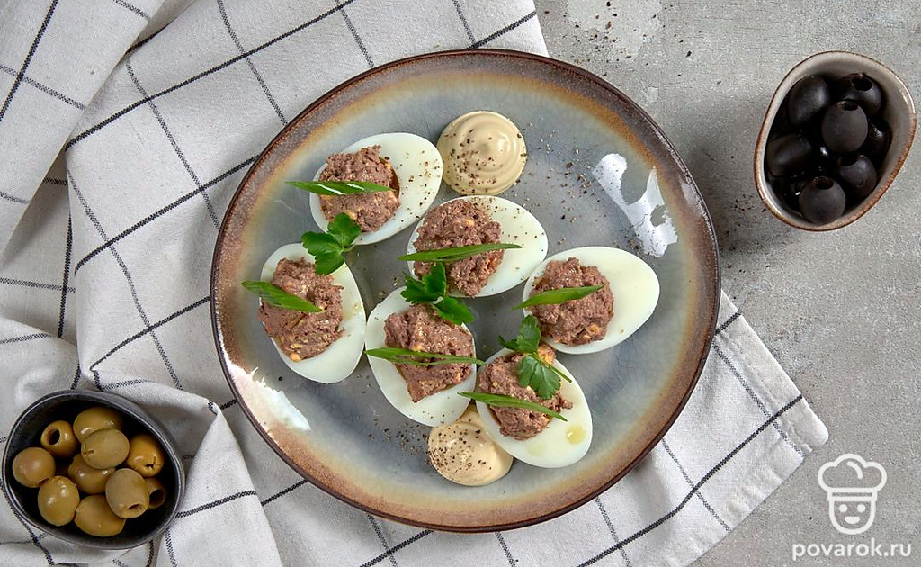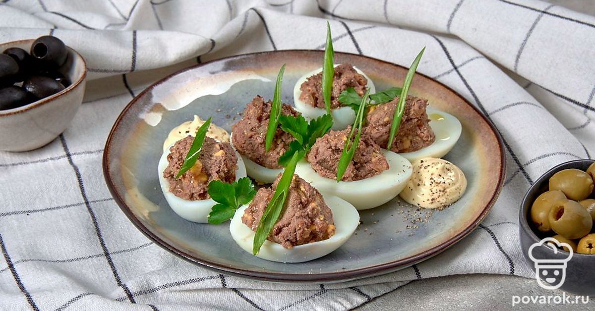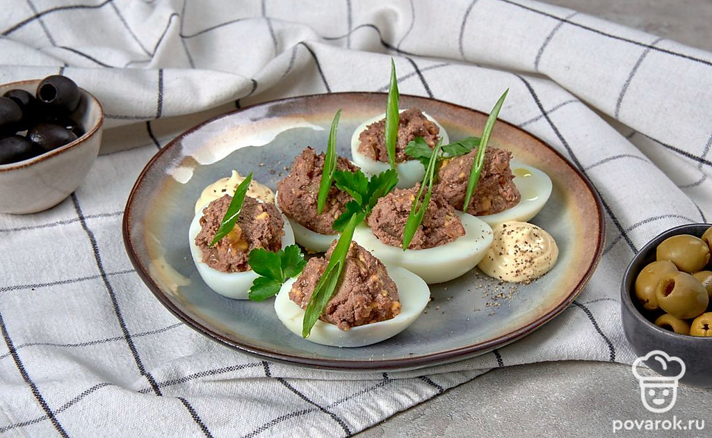 Яйца, фаршированные куриной печенью — яркая фантазийная закуска с нежным вкусом. Основную сложность в приготовлении блюда представляет подготовка яиц. Важно, чтобы поверхность белков при очистке оставалась идеально гладкой, без вмятин и царапин. В остальном — все предельно просто. Закуска получается сытной, ароматной и очень полезной.