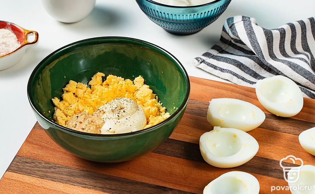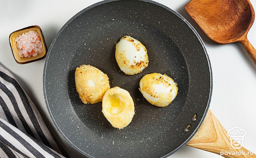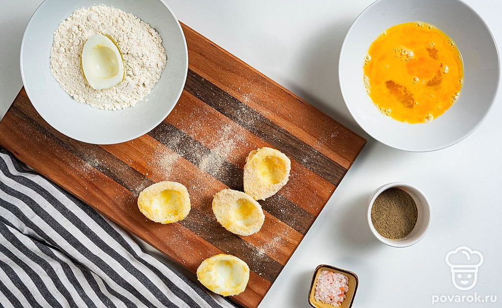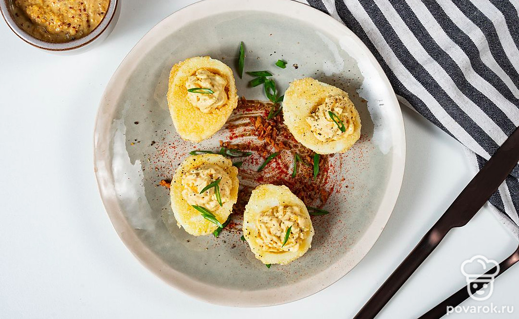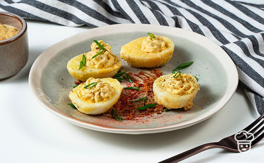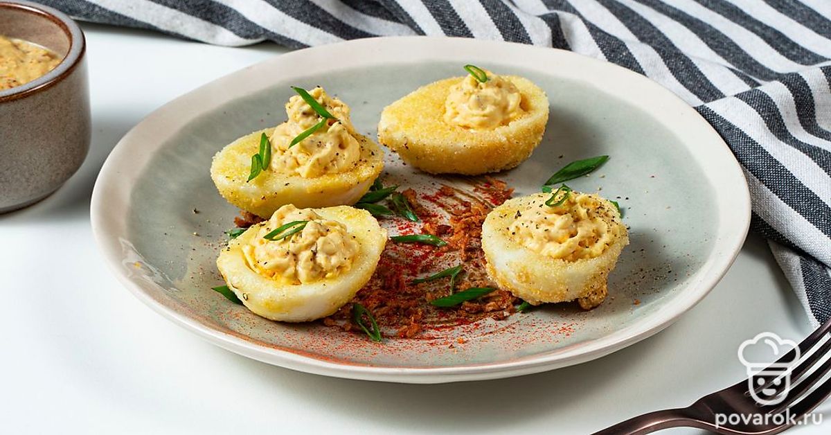 Жареные фаршированные яйца представляют собой необычную закуску с хрустящей золотистой корочкой, приятным ароматом и удивительным вкусовым сочетанием. Рецепт приготовления фаршированных яиц отнимет совсем немного времени и при этом позволит создать очень вкусное и сытное блюдо. Кстати, подавать закуску можно сразу после приготовления или спустя некоторое время. Все это благодаря тому, что ее вкусовые свойства сохраняются как в горячем, так и в холодном виде.