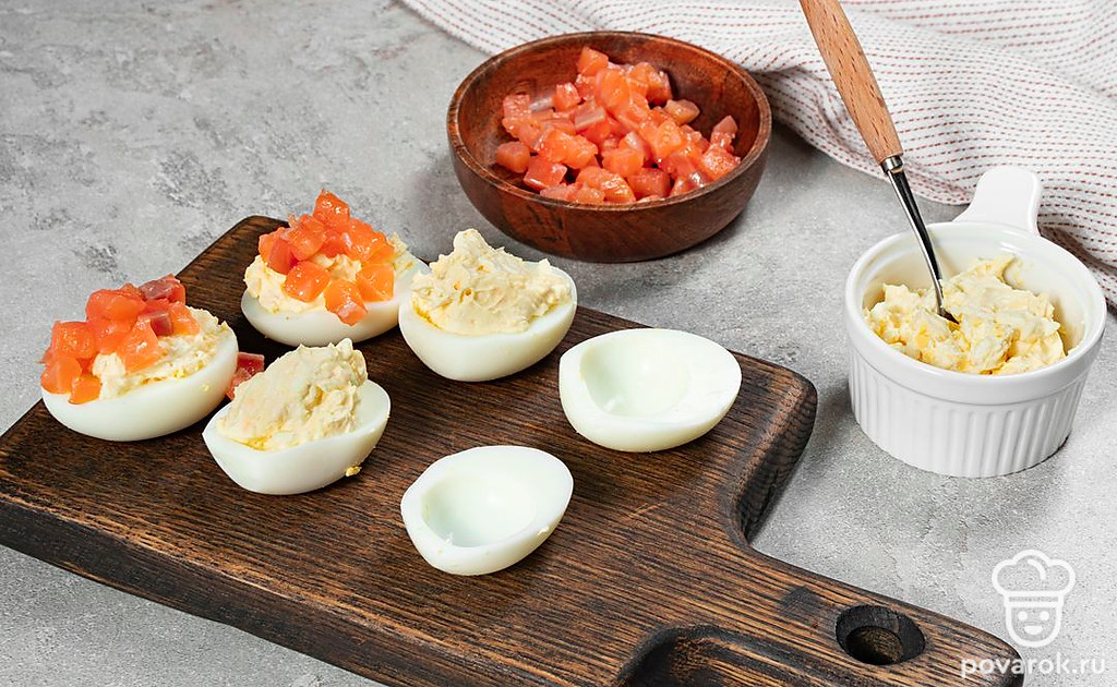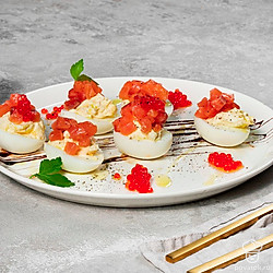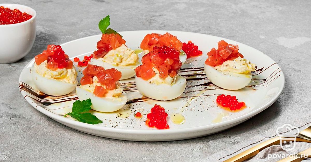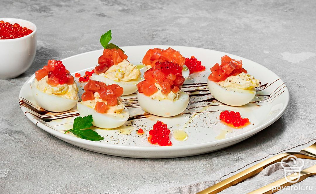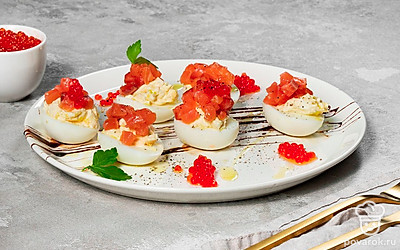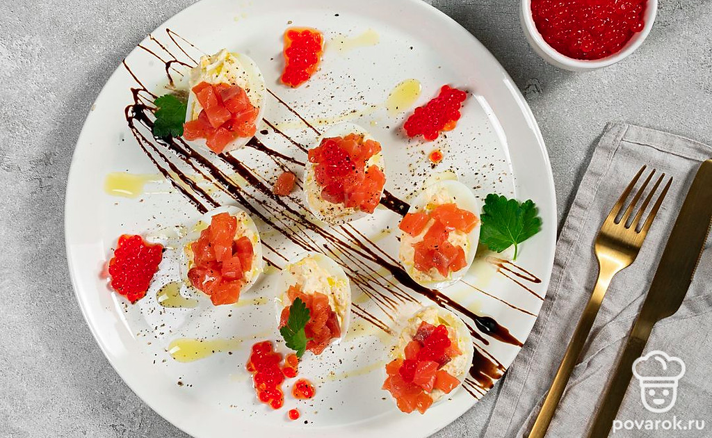 Нежные фаршированные яйца с семгой — красивый и вкусный вариант закуски. По желанию можно добавить к ним красную икру и свежую зелень. Семга полезна содержанием жирных кислот и витаминов. Также яйца и рыба содержат большое количество белка. Селен, содержащийся в семге — одна из важных составляющих для человека. Дефицит селена может являться причиной бесплодия, поэтому важно употреблять рыбу, в которой он содержится, как мужчинам, так и женщинам.
