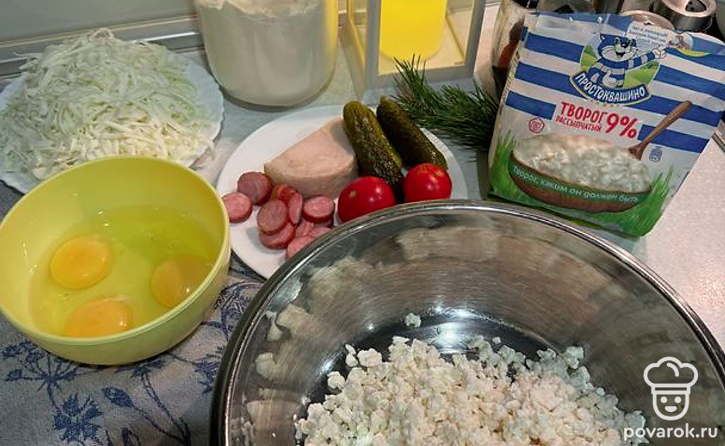Подготовьте все ингредиенты. Ветчину можно заменить на любой другой мясной продукт. Я использовала еще и сосиску.