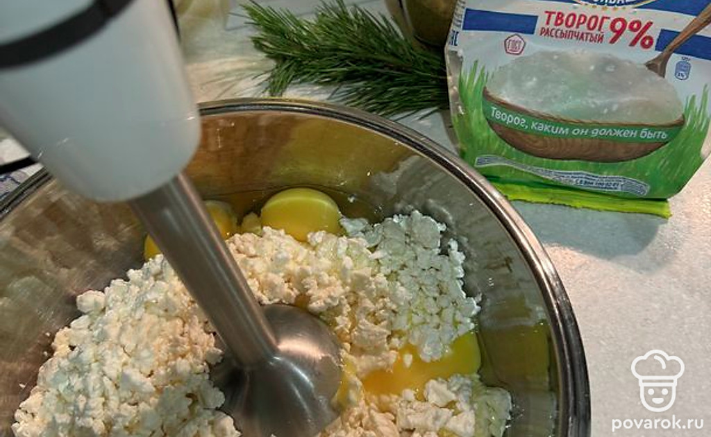 В творог вбейте яйца, добавьте специи, соль, разрыхлитель. Пробейте блендером, чтобы получилась пастообразная масса.
