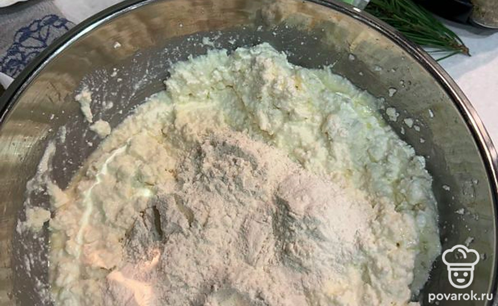 Добавьте муку. У меня ушло 7 столовых ложек, но вы смотрите по консистенции. Тесто не должно быть жидким. Оно должно липнуть к рукам.