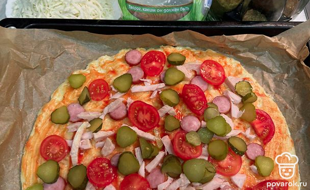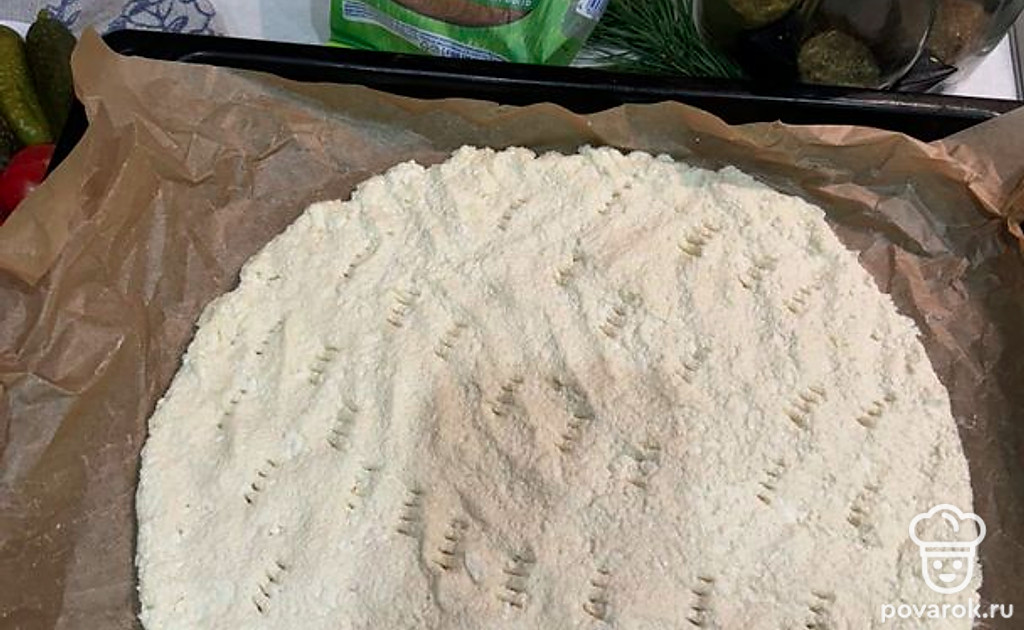 Мокрыми руками выложите тесто на застеленный пергаментом противень и сформируйте основу для пиццы. Наколите вилочкой тесто и отправьте в разогретую до 180 градусов духовку на 15 минут.