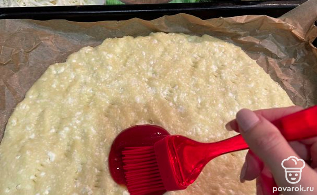Достаньте из духовки основу для пиццы, смажьте любым любимым соусом.
