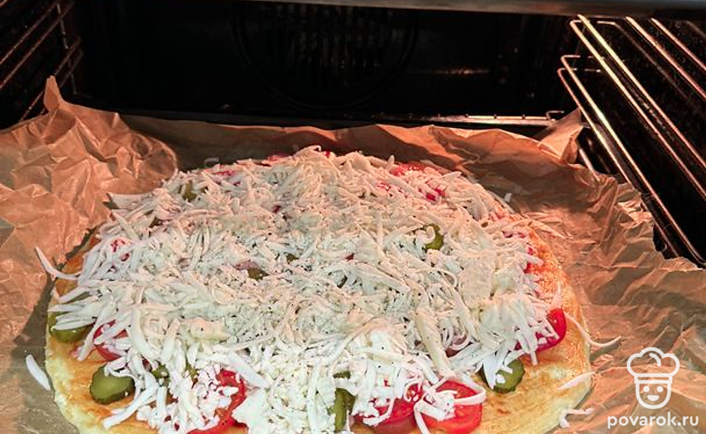 Щедро посыпьте сыром и отправьте в духовку еще на 10-15 минут. Внимательно следите за сыром. Я немного отвлеклась, и моя пицца приобрела легкий загар.