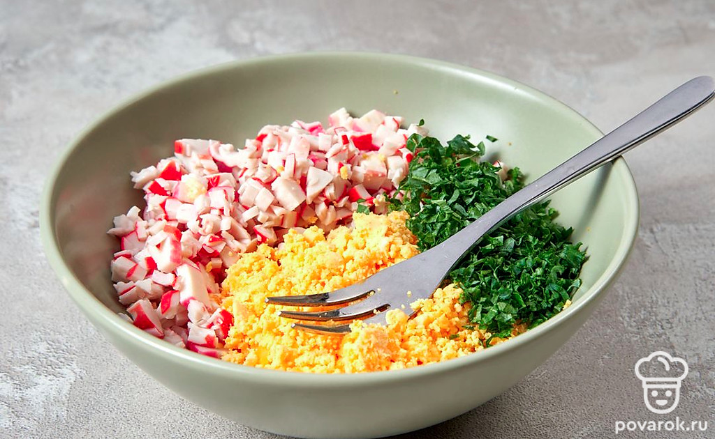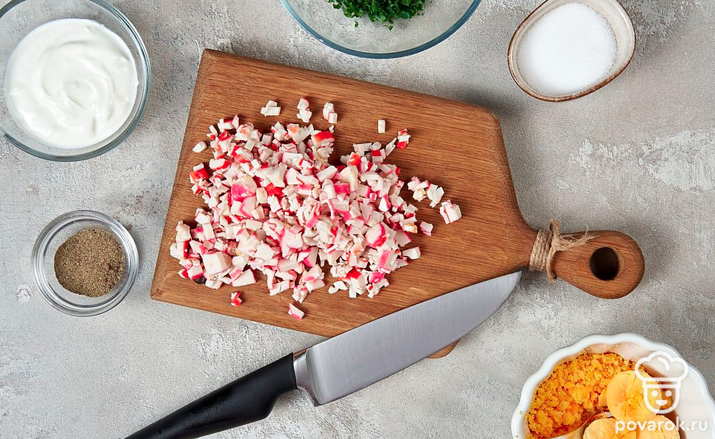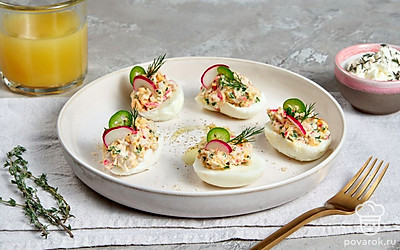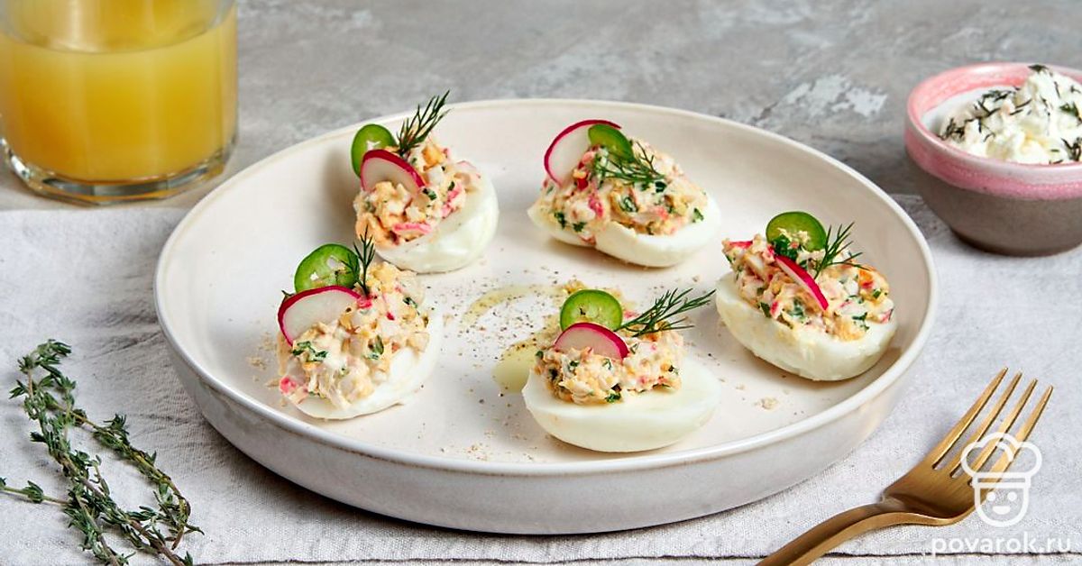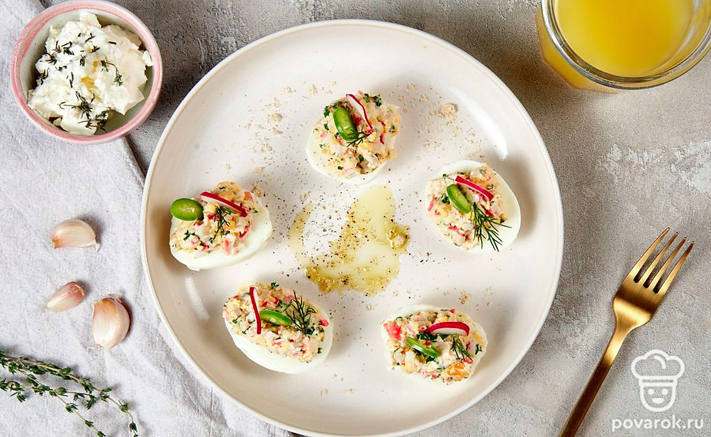 Яйца, фаршированные крабовыми палочками, сможет приготовить даже начинающая хозяйка. Самый длительный процесс — варка яиц, он займет не более 10 минут. Чтобы при варке они не треснули, добавьте в воду небольшое количество соли или пищевой соды. Скорлупа легче очистится, если остужать продукт в ледяной воде. Для большей пользы добавьте в состав начинки свежую зелень — петрушку, укроп, базилик или кинзу. Заправьте закуску натуральным йогуртом.