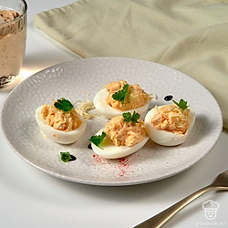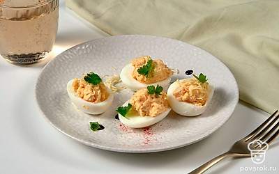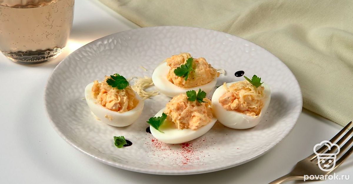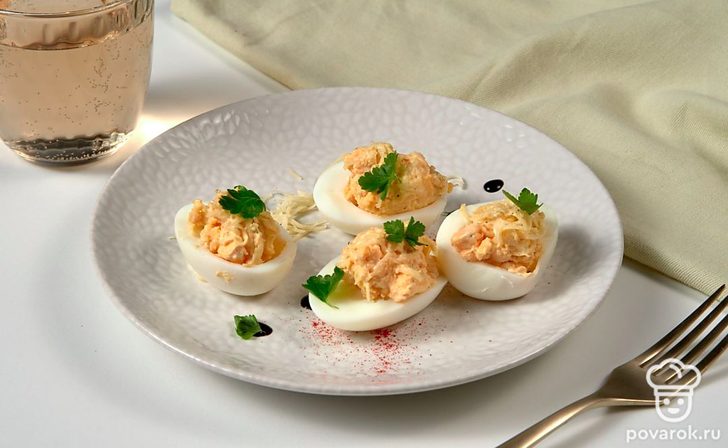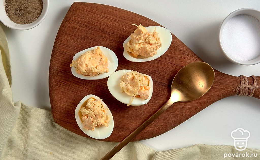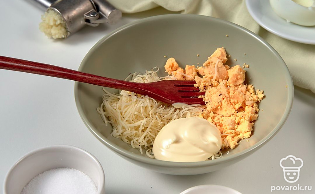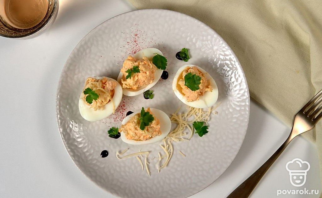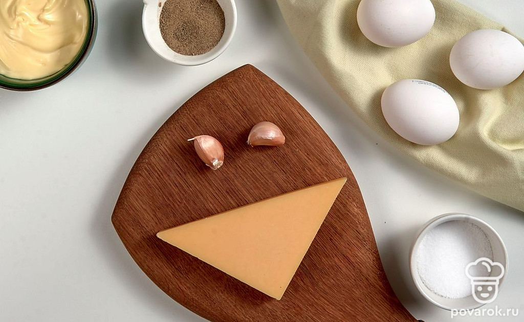 Одну из самых простых и при этом вкусных начинок для фаршированных яиц можно приготовить из сыра, чеснока и майонеза. Эти ингредиенты прекрасно сочетаются по вкусу с зеленью. Добавление чеснока делает блюдо полезным. Чеснок — древнейшая культура, которая нашла применение и в кулинарии, и в медицине. Его родина — Средняя Азия. Он укрепляет иммунитет, помогает справиться с патогенной микрофлорой кишечника, ускоряет обменные процессы.