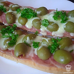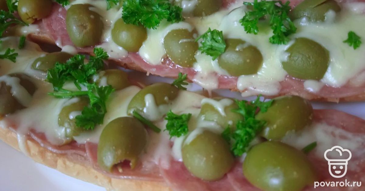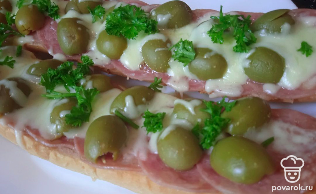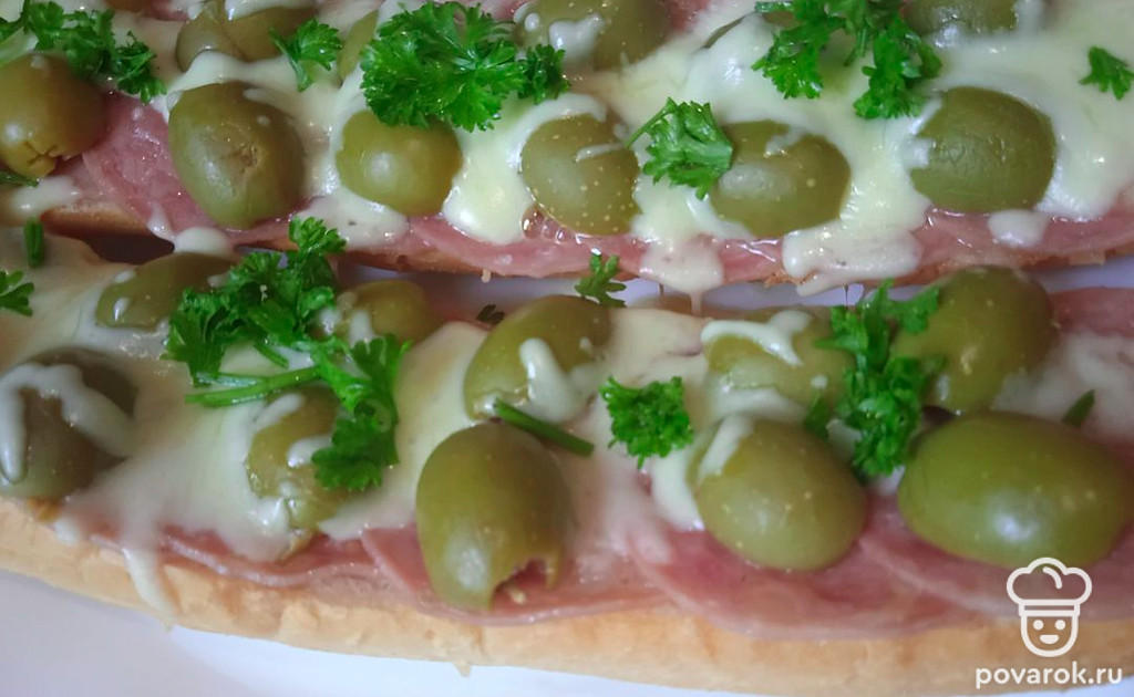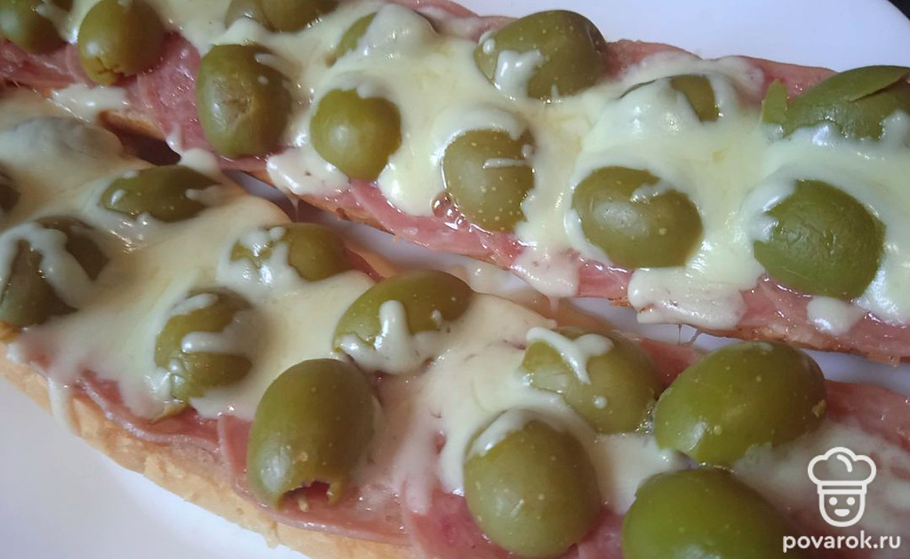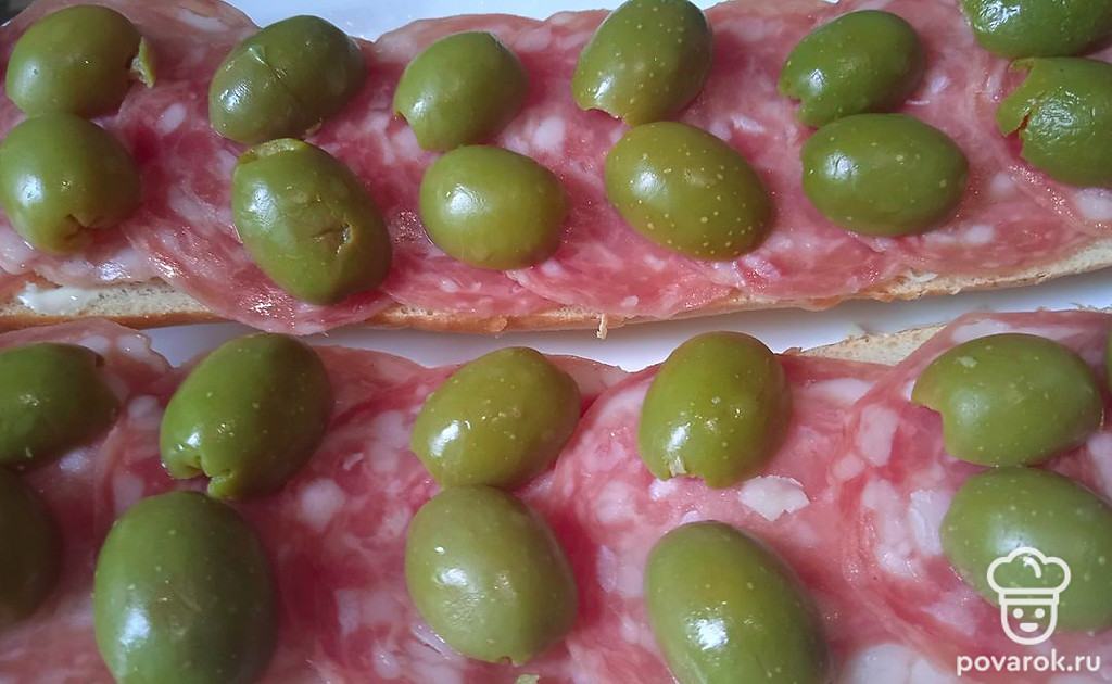 Сыр моцарелла натрите на терке. Распределите поверх оливок. Поставьте на две минуты в микроволновку.