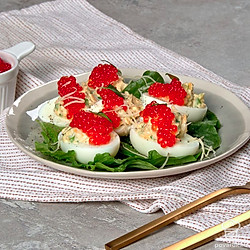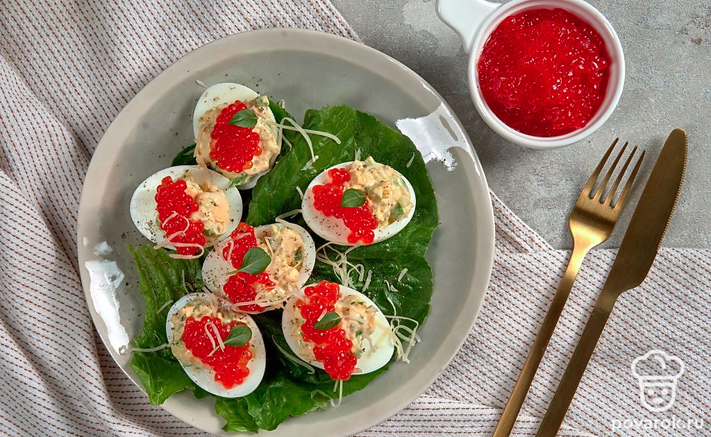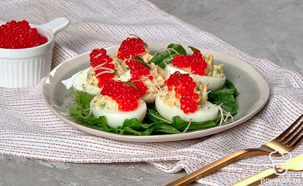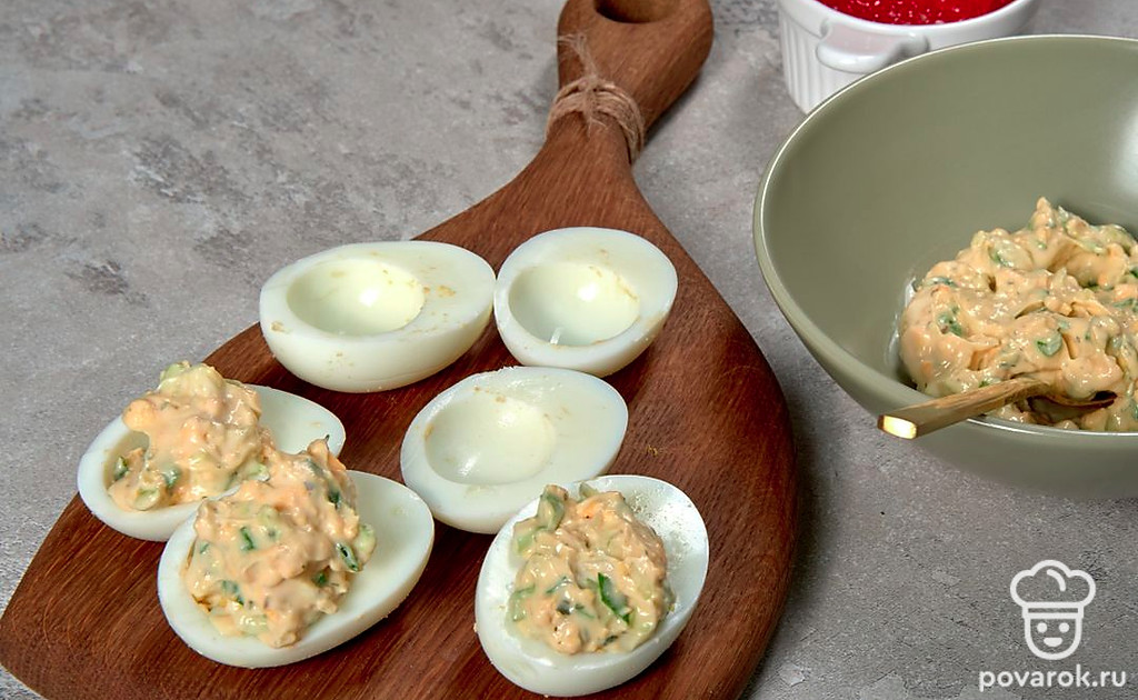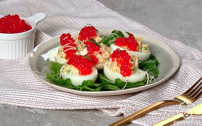 Яйца, фаршированные красной икрой, традиционная холодная закуска на новогоднем столе. Вылов лососевых происходит с мая по октябрь, продукция, произведенная в этот период, содержит свежую икру, которая не замораживалась. Лучше всего транспортировку переносит икра в жестяной банке, которая защищает от света, тем самым не дает омега-кислотам распадаться. По этой причине для консервации икры в жести используется меньше соли.