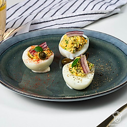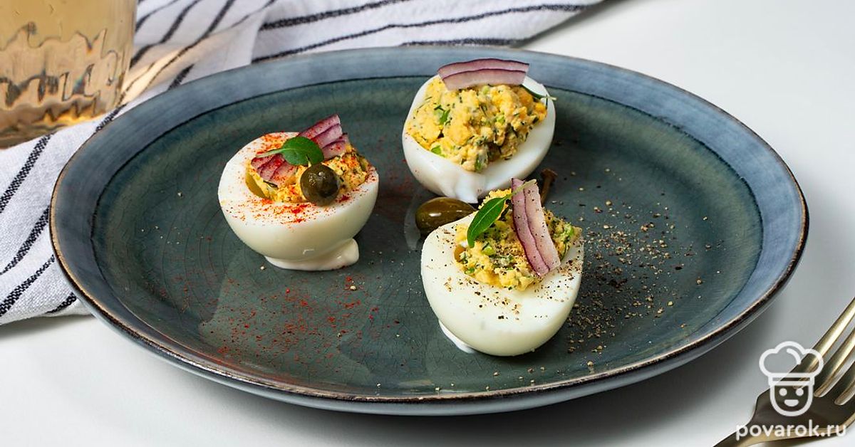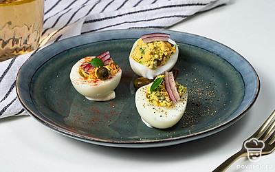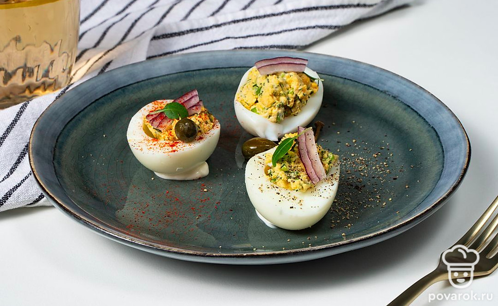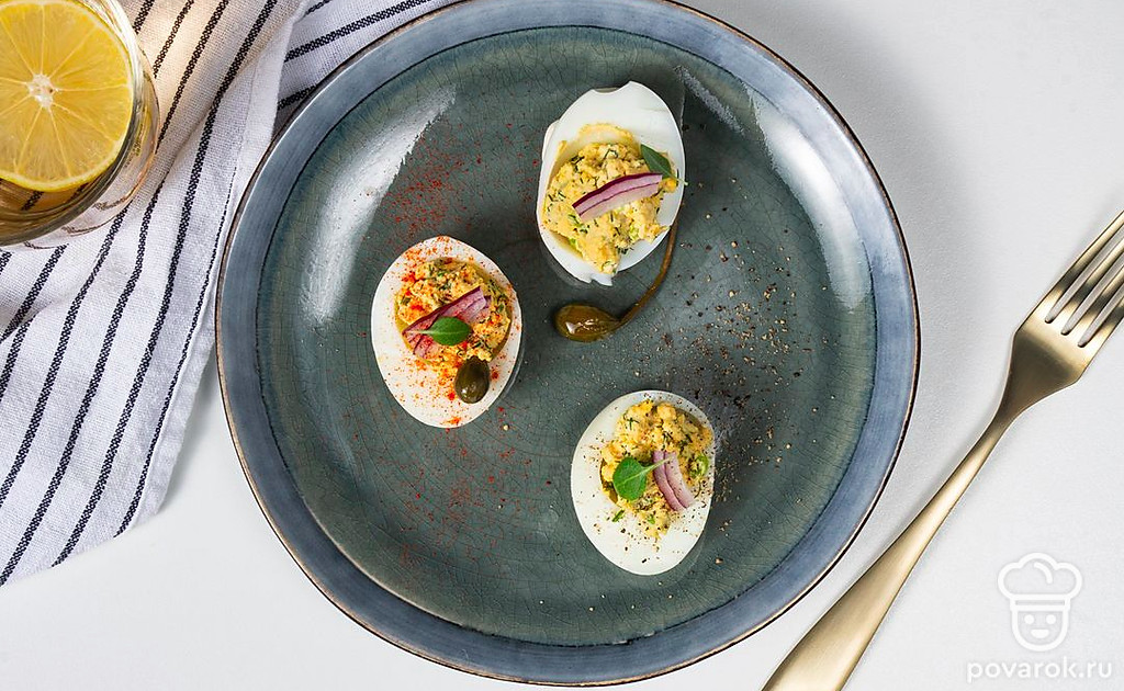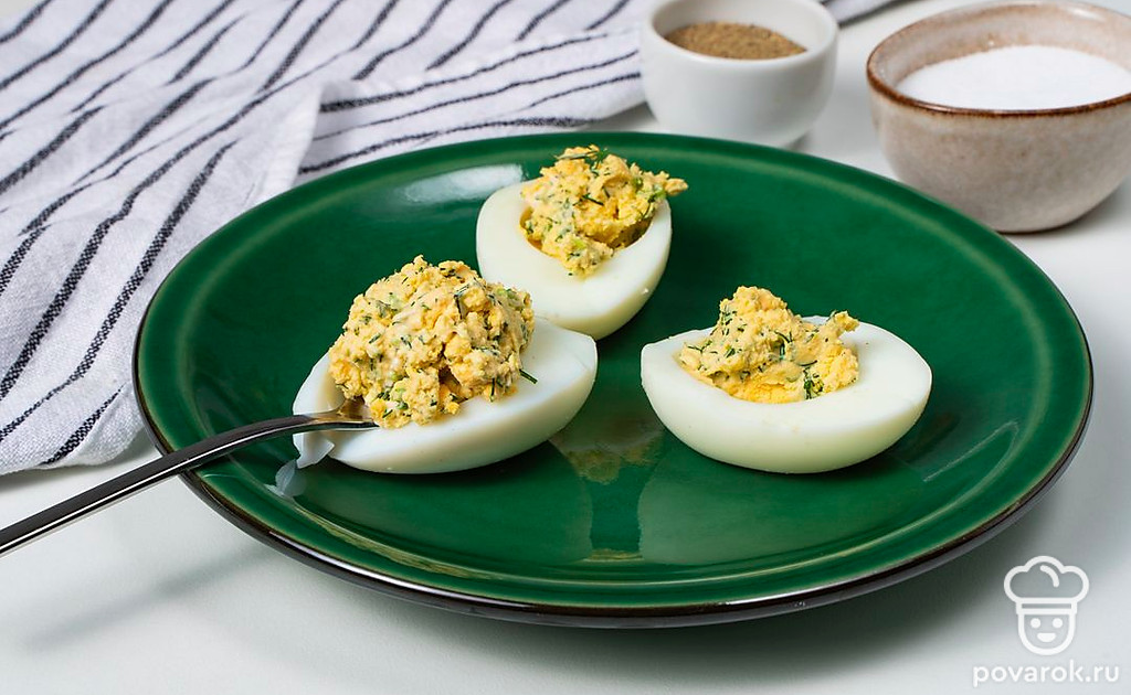 Нафаршируйте яйца. Возьмите чайную ложку и наполните белки начинкой. Сверху сделайте "шапочку".