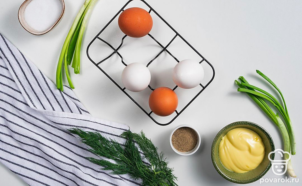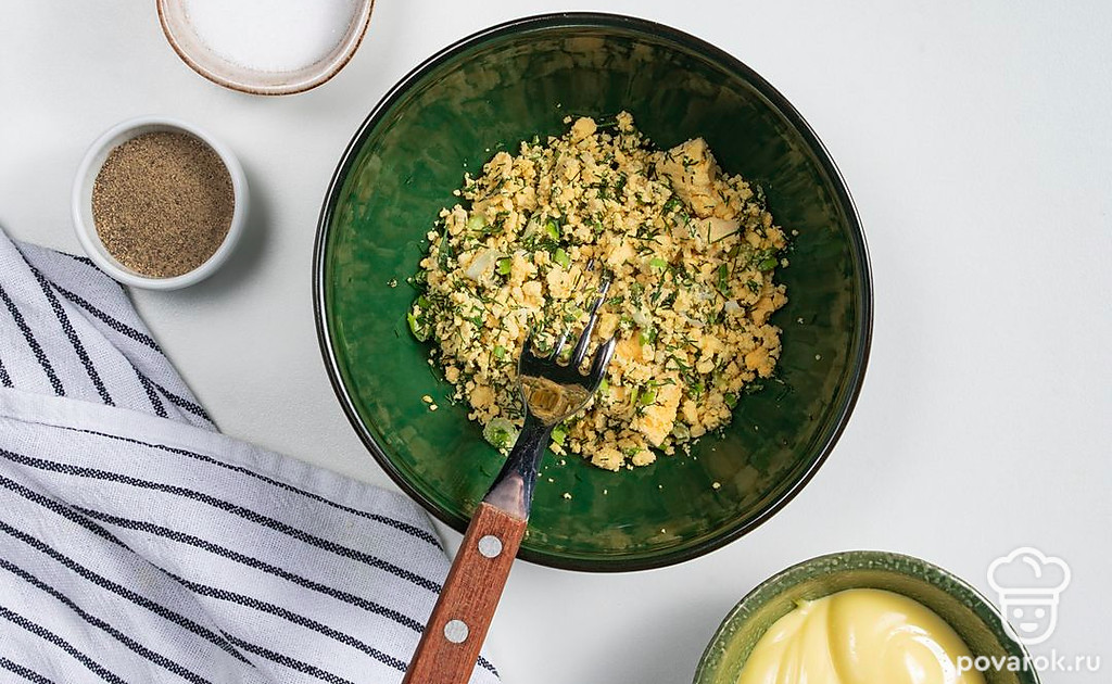 Приготовьте начинку. Смешайте желтки, зеленый лук, укроп и майонез. Посолите и поперчите по вкусу.
