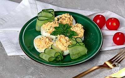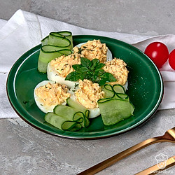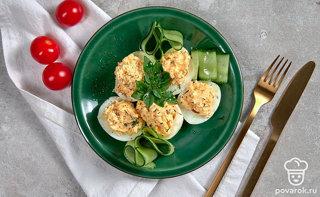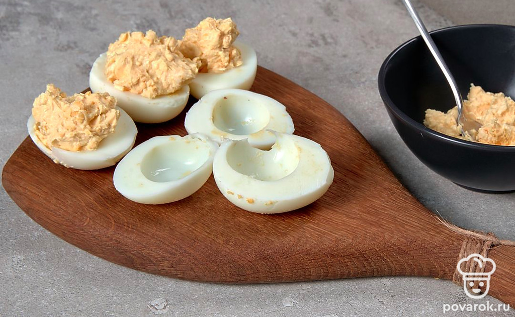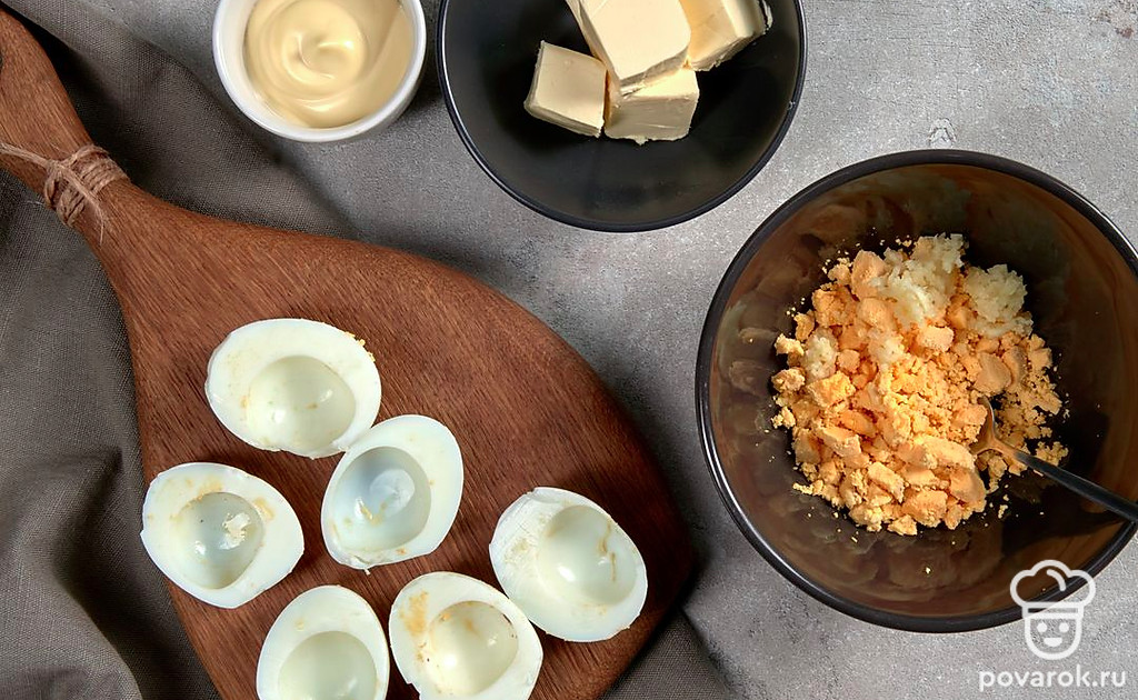 Яйца, фаршированные желтком с майонезом, наипростейший вариант закуски. Чтобы выбрать качественные куриные яйца, обращайте внимание на скорлупу — на ней не должно быть трещин, перьев и грязи. Цвет у скорлупы должен быть матовый, а не глянцевый. Для изящной подачи возьмите перепелиные яйца, если хотите удивить гостей — используйте гусиные. Для пикантности добавьте в начинку немного чеснока — свежего или сушеного.
