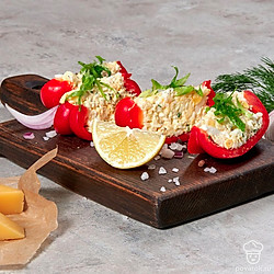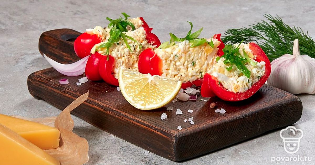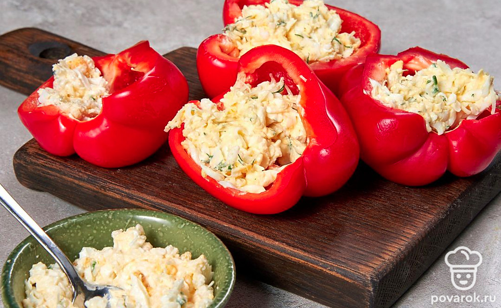 Фаршированный яйцами и сыром перец обязательно привлечет внимание на праздничном столе. Если использовать перец разных цветов, закуска получится не только яркой, но и полезной. В красных сортах овоща больше всего витамина А и С. Желтый перец содержит калий и фосфор больше, чем в других сортах. Зеленый — богат витамином В и железом. Чтобы легко очистить вареные яйца, залейте холодной водой и оставьте остывать. Скорлупа из-за перепада температуры покрывается микротрещинами и затем легко снимается.
