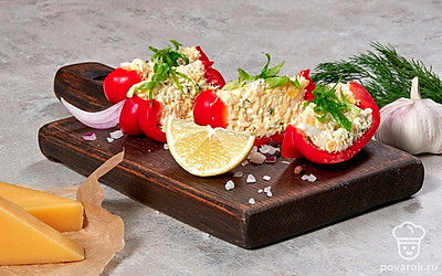 Нафаршируйте перцы. Половинки перцев полностью заполните начинкой, разровняйте и утрамбуйте ее. Разрежьте перцы пополам, а затем порежьте еще надвое. Закуска получается в форме продолговатых полумесяцев.