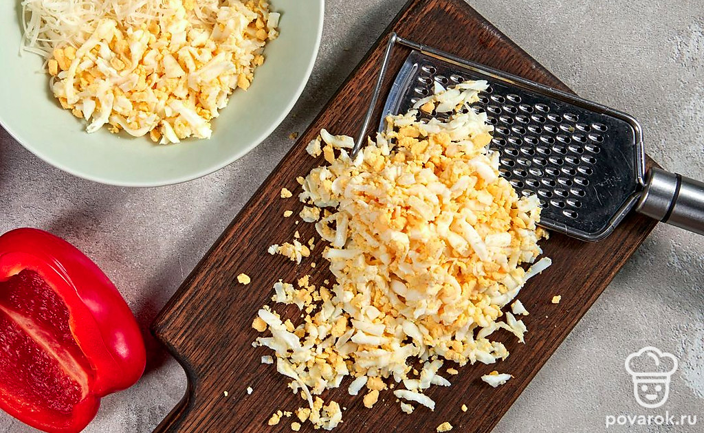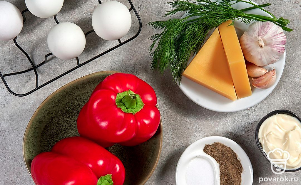 Отварите яйца вкрутую (9 минут с момента закипания воды), остудите и натрите на крупной терке. Укроп ополосните, обсушите и мелко нарежьте. Чеснок очистите и пропустите через пресс. Сыр натрите на мелкой терке. Болгарские перцы ыфмойте, оботрите бумажными полотенцами и разрежьте пополам. Удалите семена и перегородки.