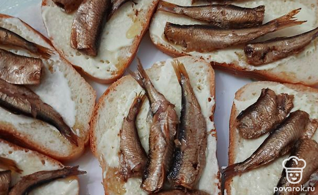 Берем готовый нарезной батон, смазываем каждый кусочек 1 чайной ложкой майонеза и раскладываем шпроты.