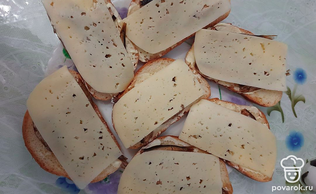 Сверху на каждый бутерброд кладем по 2 ломтика сыра так, чтобы он полностью закрывал шпроты.
